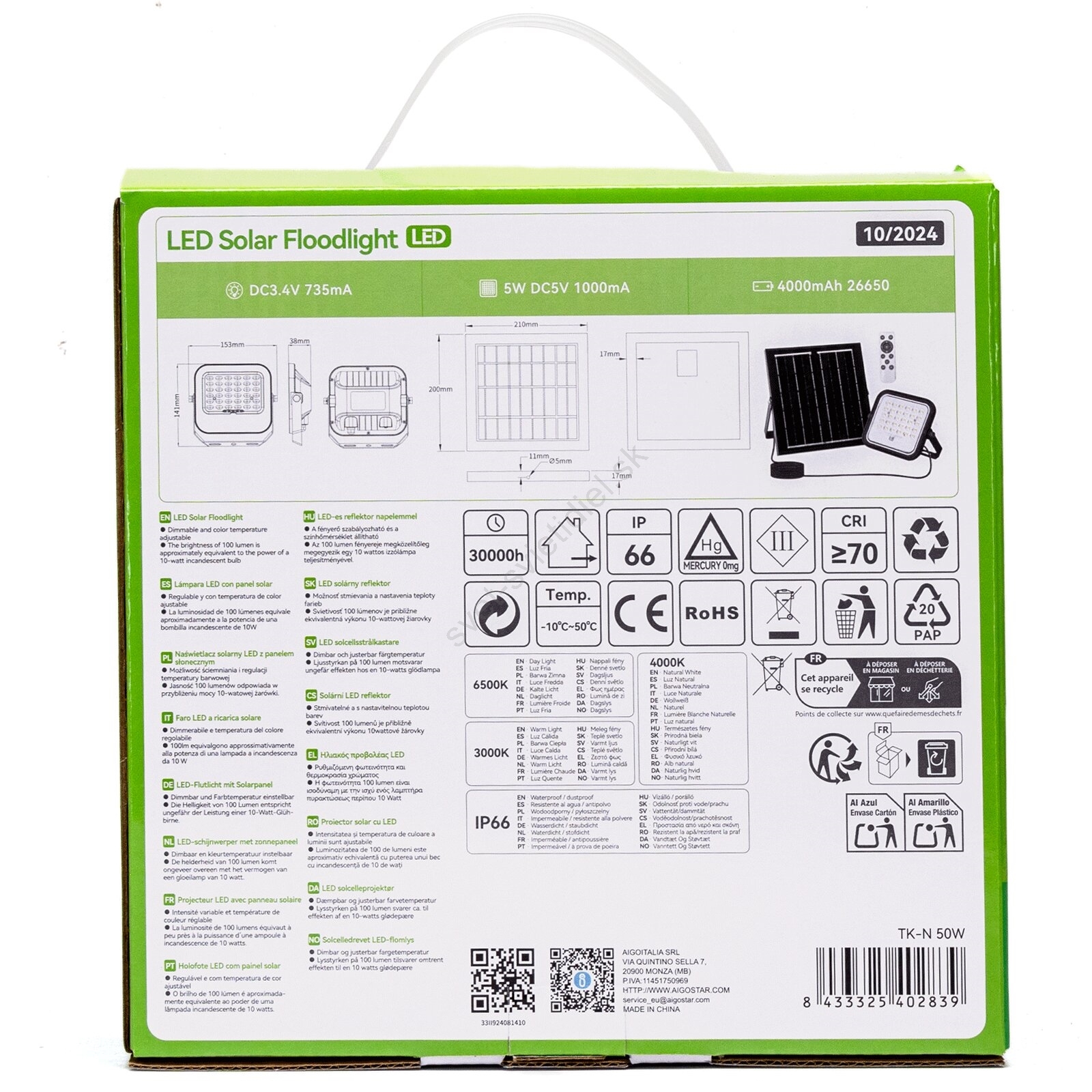 Aigostar - LED stmievateľný solárny reflektor LED/50W/3,4V 3000/4000/6500K IP66 4000 mAh + diaľkové ovládanie
