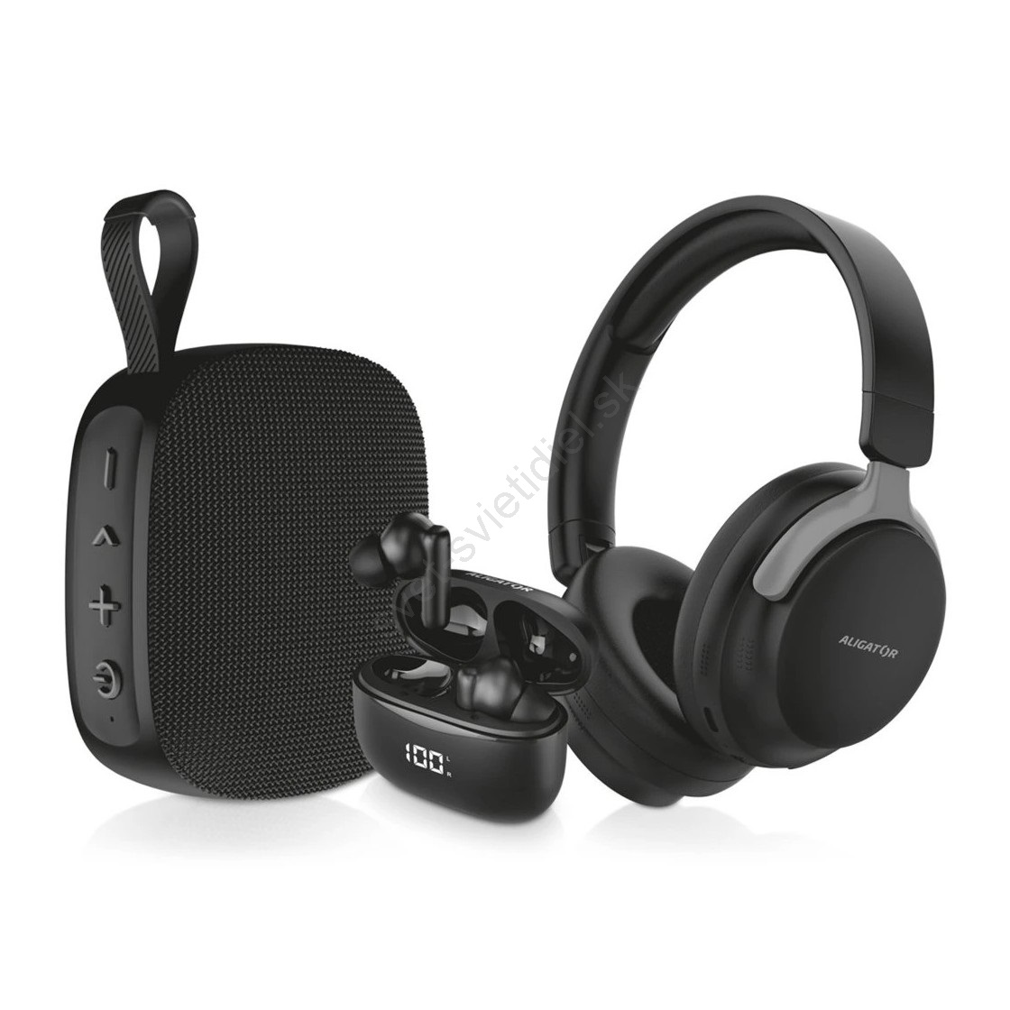 Aligator AUC001 - AUDIO COMBO 3 v 1: náhlavné slúchadlá 150 mAh, bezdrôtové slúchadlá 200 mAh + 2x 30 mAh a reproduktor 1200 mAh
