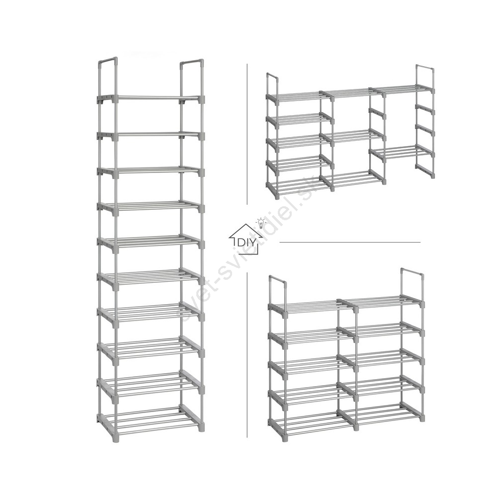 • Vďaka svojmu štíhlemu tvaru zaberá tento 10-policový botník málo miesta na podlahe a pritom ponúka dostatok úložného priestoru pre 20 párov topánok.