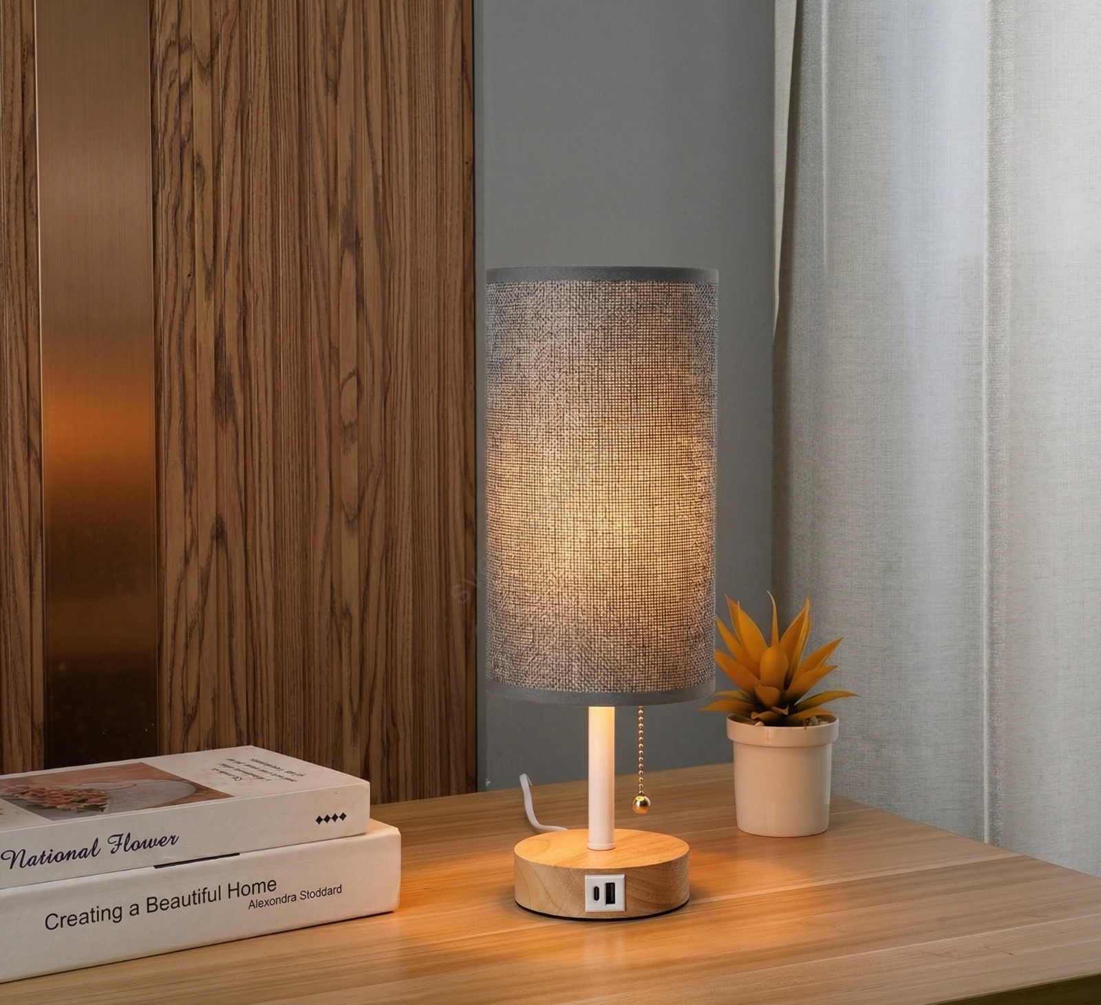 • Brilagi - Stolná lampa s USB portom TABLON 1xE27/25W/230V dub/béžová/sivá