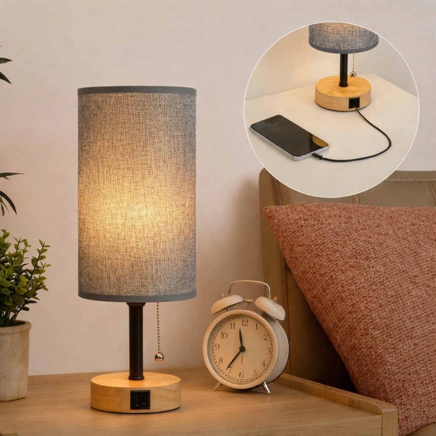• Brilagi - Stolná lampa s USB portom TABLON 1xE27/25W/230V dub/béžová/sivá