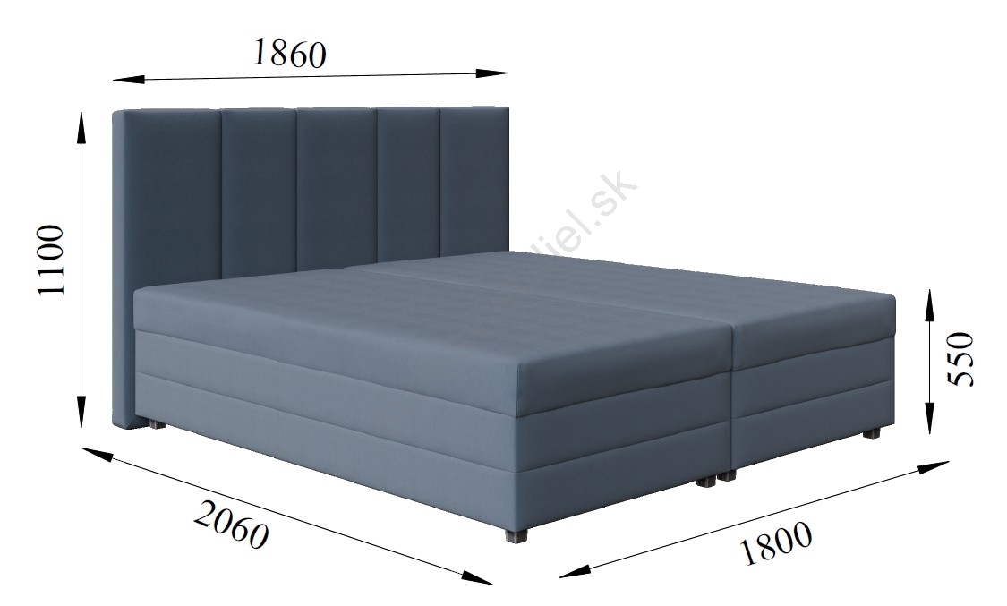 • Čalúnená manželská posteľ s pružinovými matracami a vysokým rovným elegantným čelom.