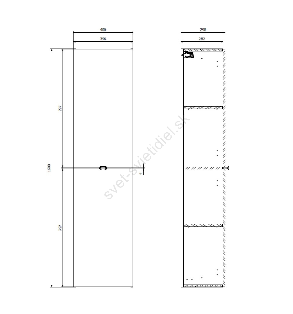 • Predný panel, korpus a vnútorné police skrinky sú vyrobené z 16 mm drevotriesky s bielym lakom.