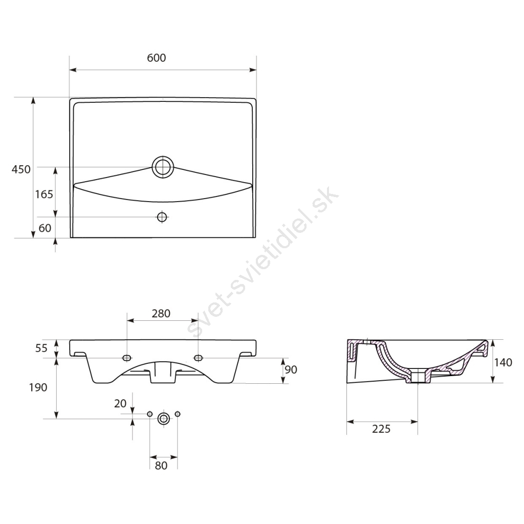 • Keramické umývadlo má klasický obdĺžnikový tvar s otvorom pre batériu a prepadom.