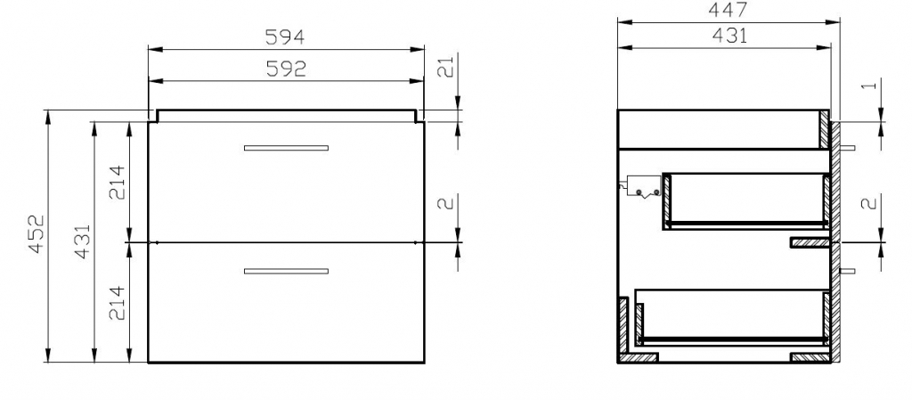 • Skrinka má dve priestranné zásuvky s tlmeným dovieraním a chrómovanými úchytkami.