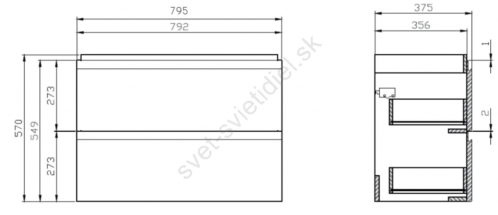 • Skrinka má dve priestranné zásuvky s tlmeným dovieraním a skrytými úchytkami.