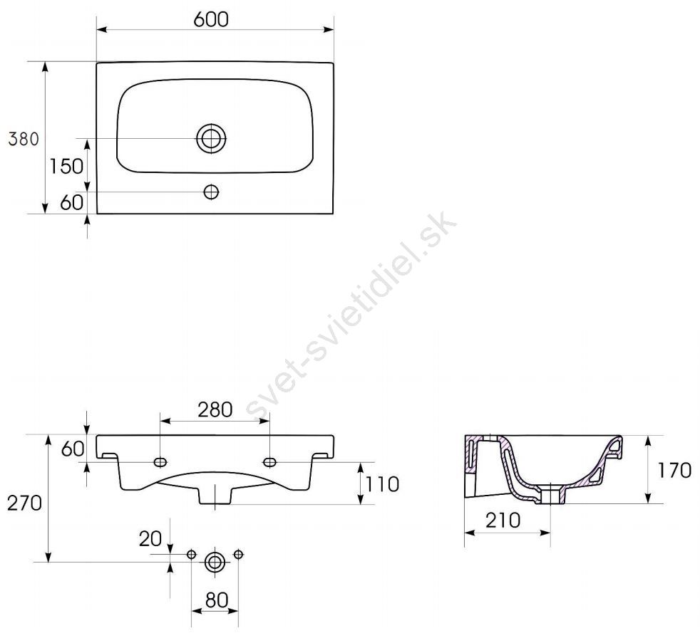 • Keramické umývadlo má klasický obdĺžnikový tvar s otvorom pre batériu a prepadom.