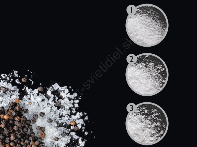 • Na dosiahnutie jemného až hrubého mletia jednoducho otočte prstencem na jednu zo šiestich (korenie) alebo troch (soľ) prednastavených hrubostí.