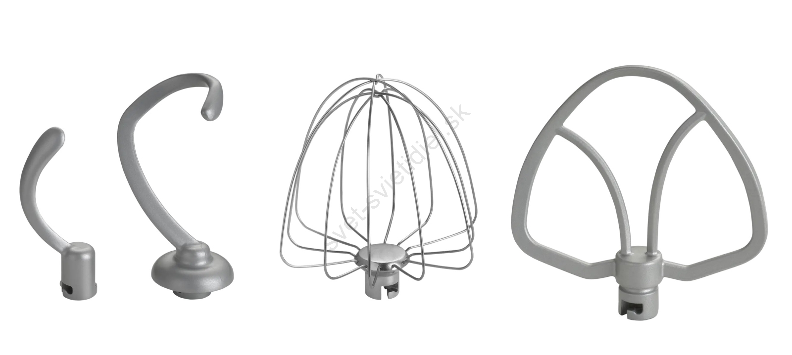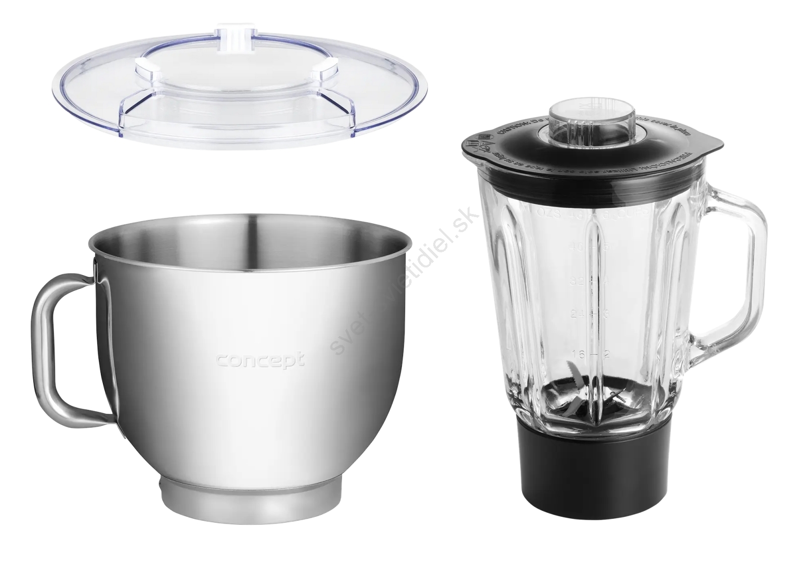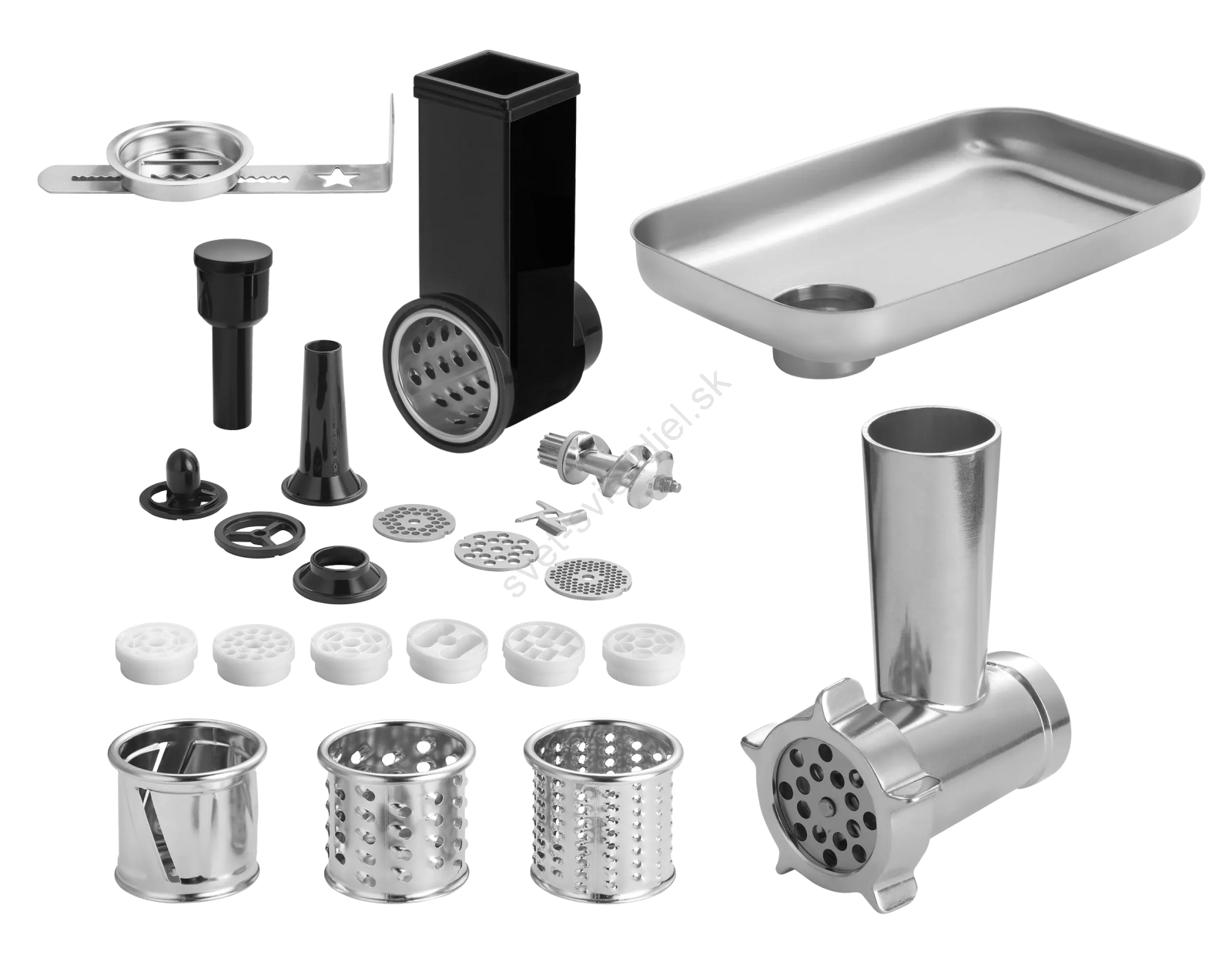 • Príslušenstvo v balení: 2 hnetacie háky, celokovová šľahacia metla, miešacia metla, nerezová nádoba s madlom 7 l, plastové viečko, sklenený mixér (1,5 l), mlynček na mäso (3 kotúče), nástavec na cestoviny (6 nástavcov na výrobu domácich cestovín), tvarovač na cukrovinky (tvořítko na cukroví), nástavec na plnenie klobás, nástavec na plnenie mäsových guľôčok, strúhadlo (3 nástavce).