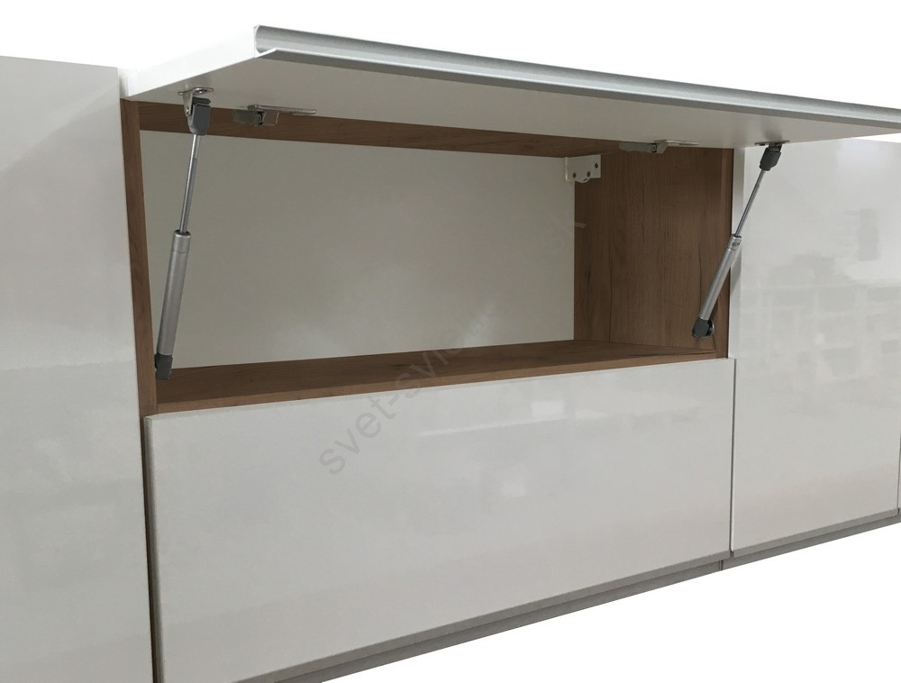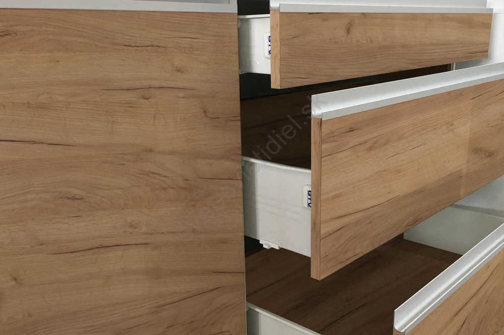 • Horné skrinky sú vybavené plynovými piestami, v zásuvkách sú zabudované kvalitné zapuzdrené kovové pojazdy.