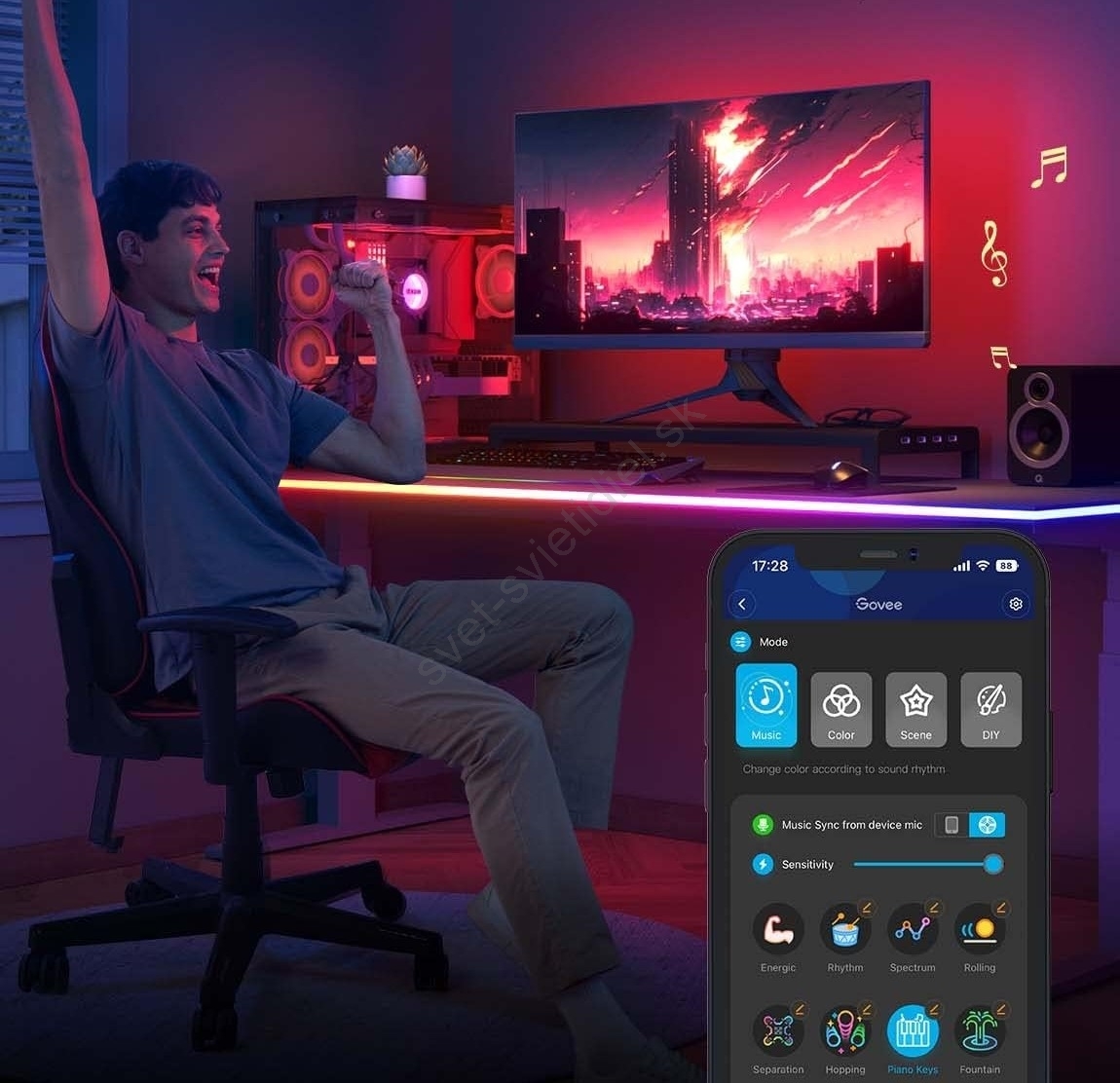 • RGB – 16 miliónov farieb, viac než 64 scénických režimov, 11 rytmických režimov a možnosť vlastných farieb DIY.