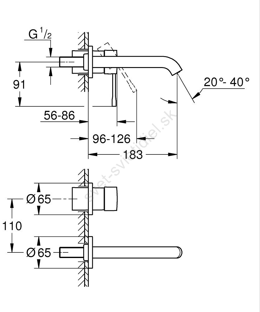 • Vzdialenosť medzi stredom rukoväte a výtokom je 110 mm, dĺžka výtoku 183 mm.