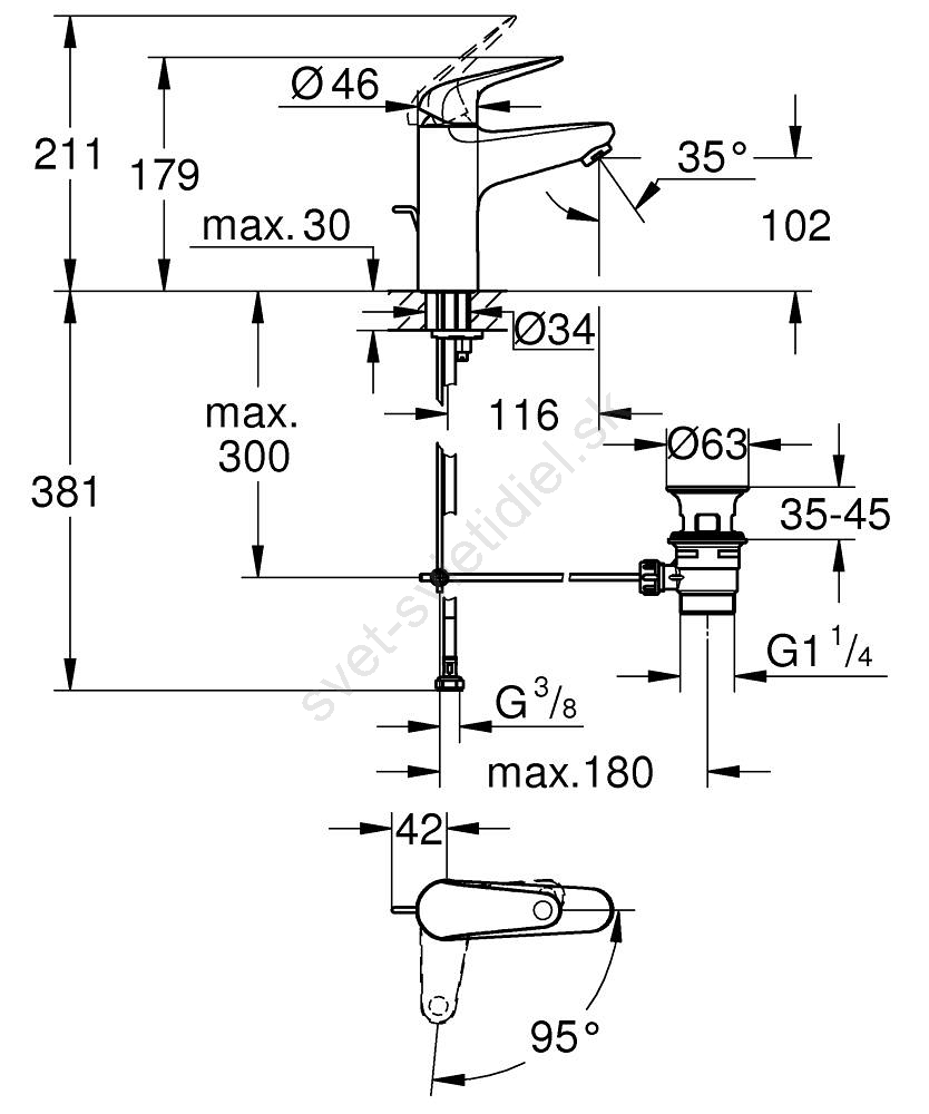 • Páková umývadlová batéria veľkosti M s výškou 179 mm a dĺžkou ramienka 116 mm.