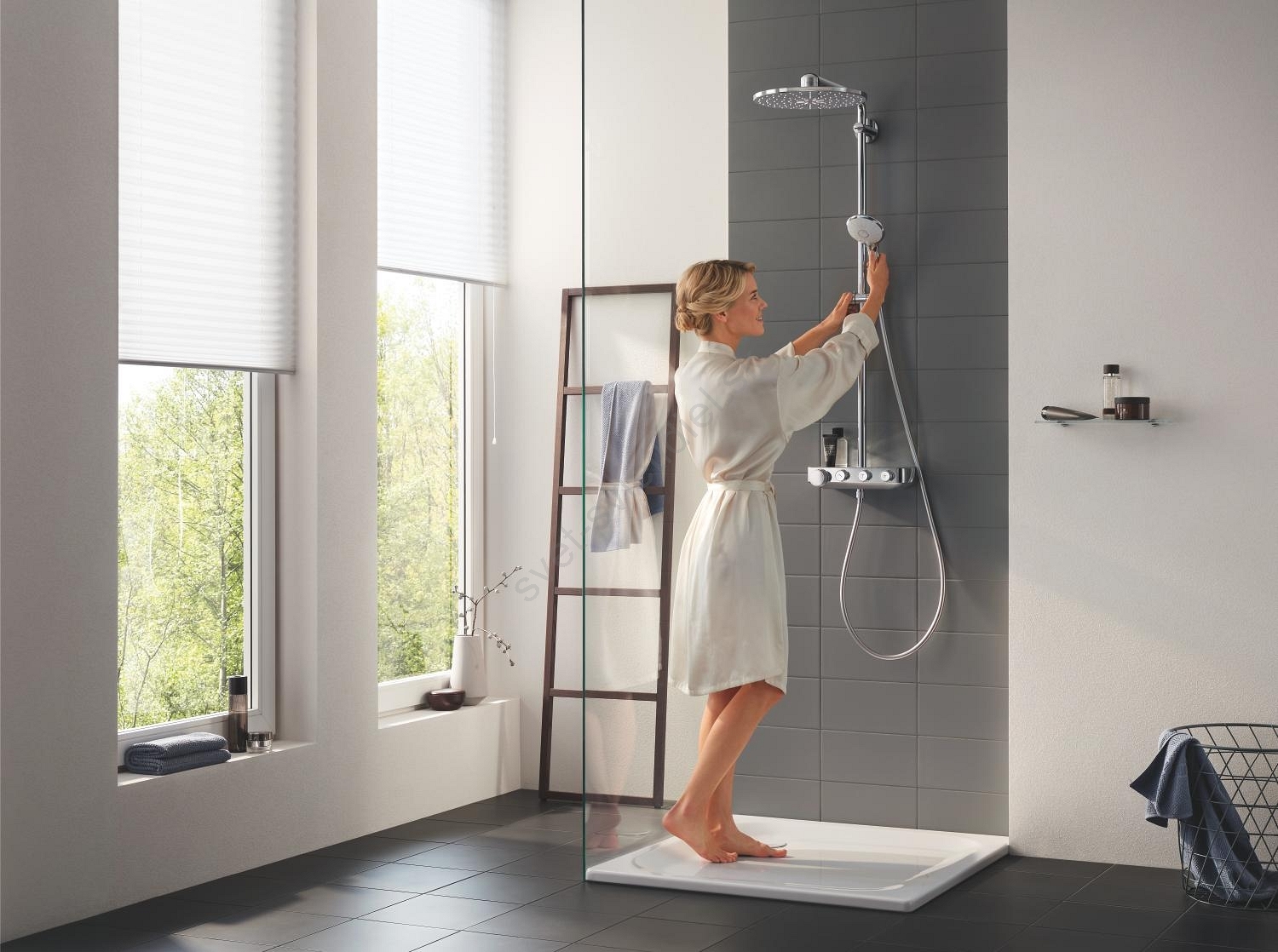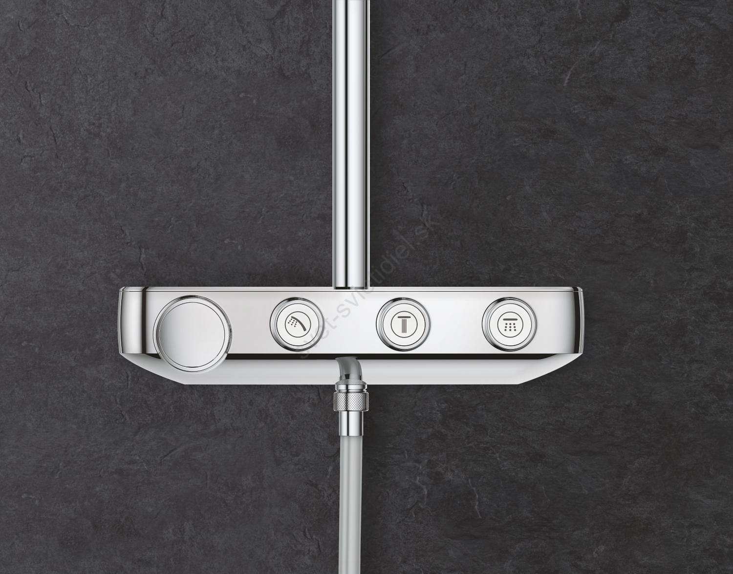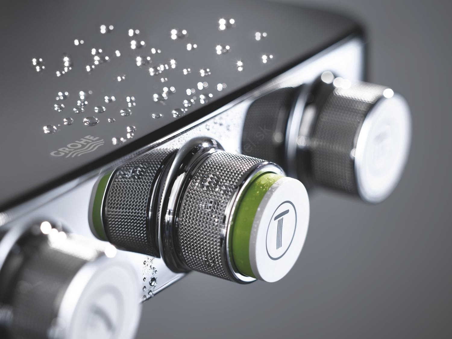 • Inovatívna technológia GROHE SmartControl umožňuje jednoduché prepínanie medzi hlavovou a ručnou sprchou a nastavenie prietoku vody stlačením a otočením tlačidla.
