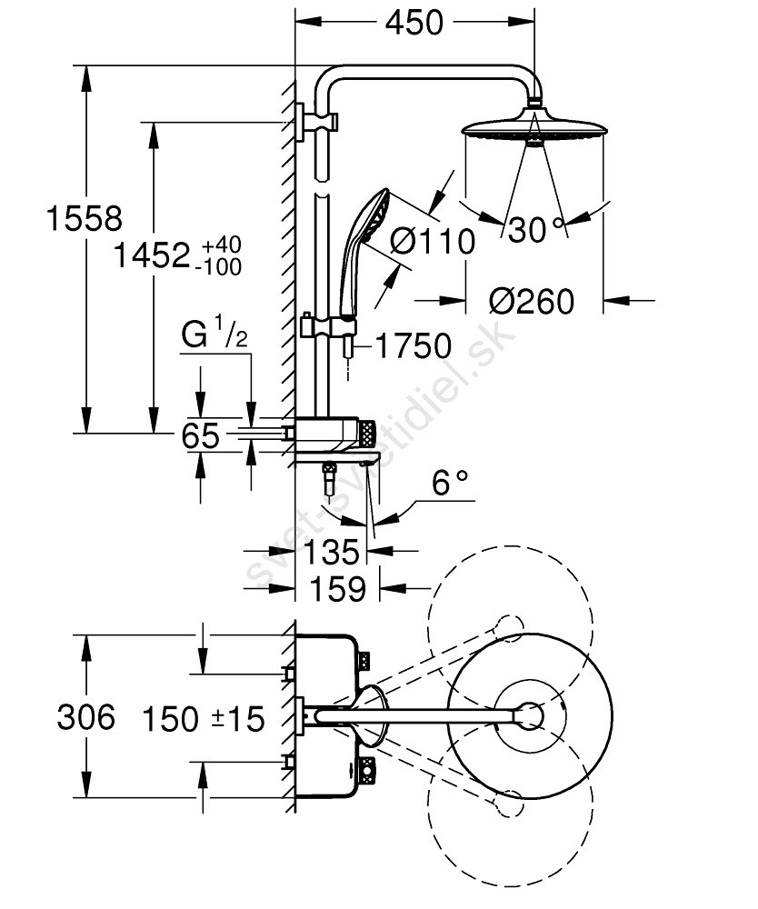• Horizontálne otočné sprchové rameno dĺžky 450 mm pre flexibilné nastavenie.