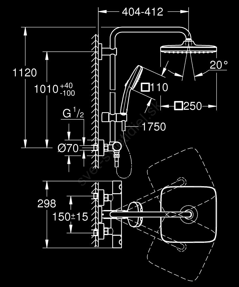 • Nástenná termostatická batéria s funkciou Aquadimmer umožňuje jednoduché prepínanie medzi hlavovou a ručnou sprchou.