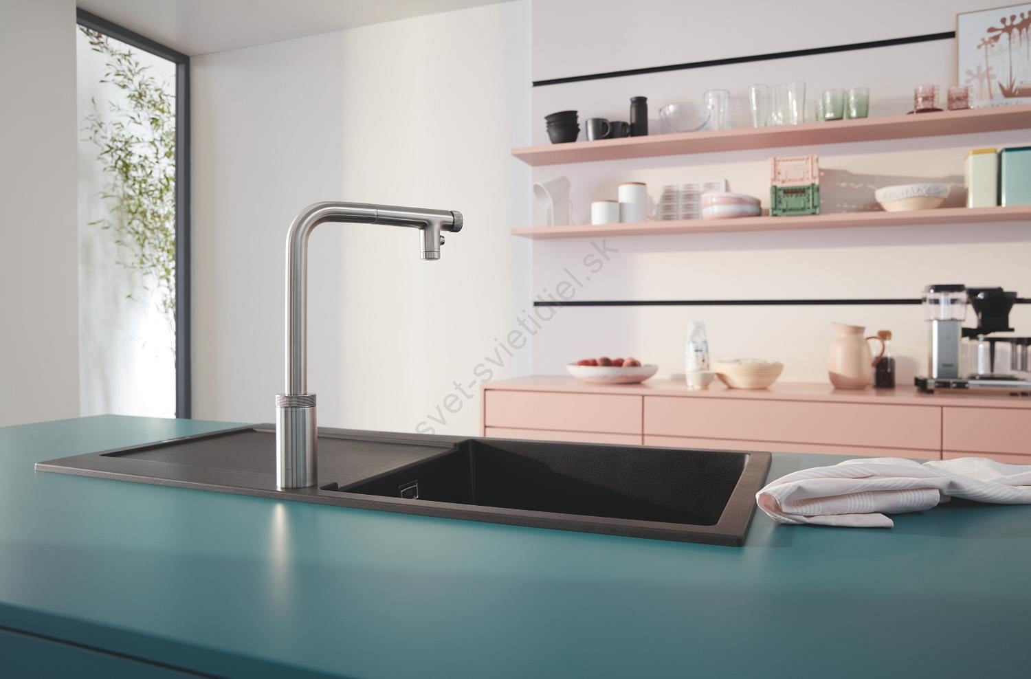 • Kompozitný drez GROHE K500 s odkvapávačom – robustný produkt, ktorý sa ľahko čistí a tlmí hluk.