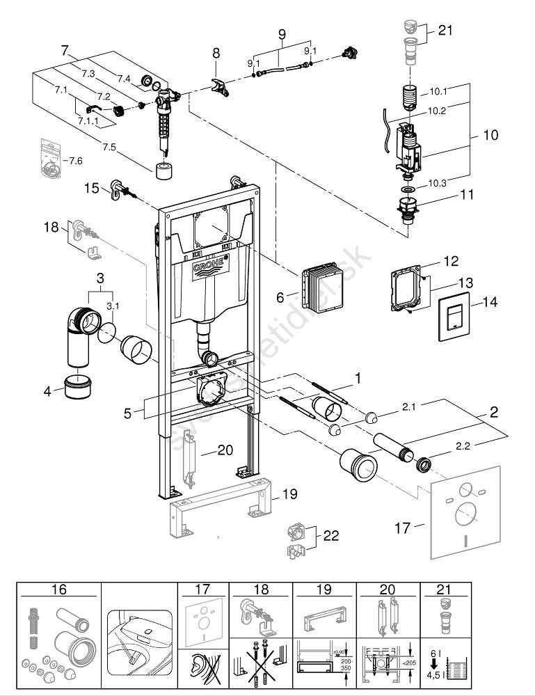 • Kompletná sada 3 v 1 pre zavesené WC s montážnou výškou 1,13 m.
