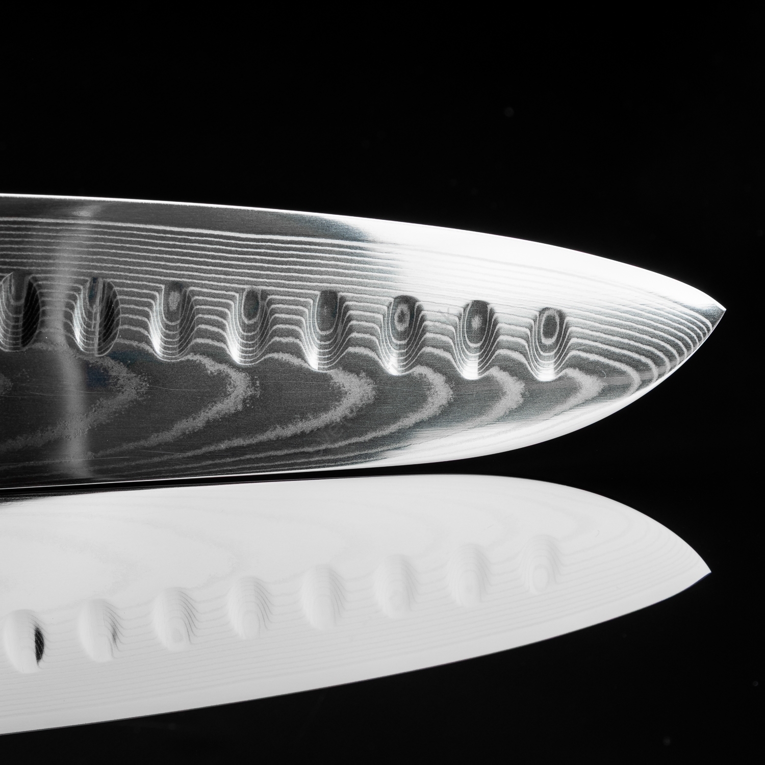 • Čepeľ dĺžky 180 mm tvorí 67 vrstiev damaškovej ocele s tvrdým jadrom z VG10, ktoré zaručuje extrémnu ostrosť a dlhodobú stabilitu ostria.