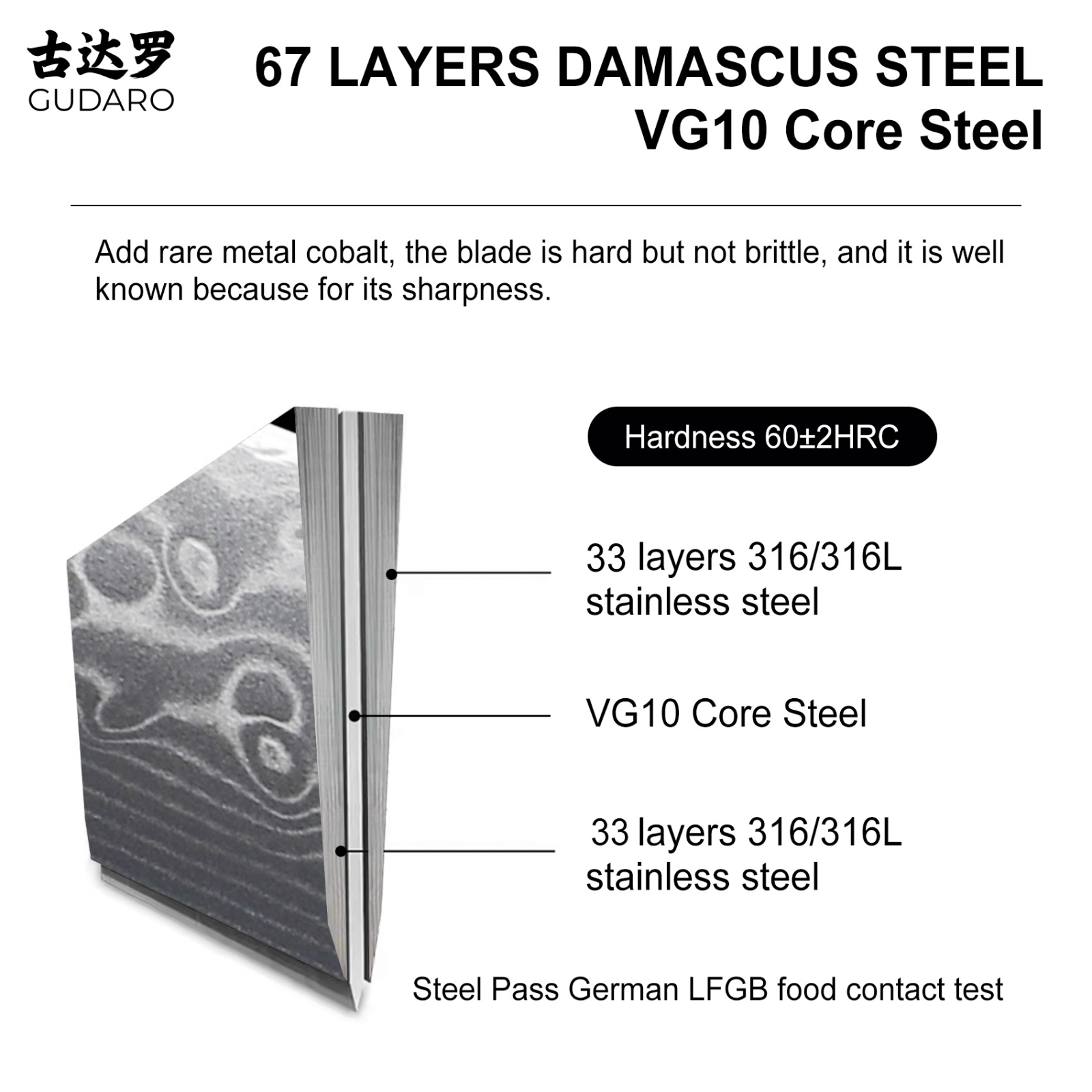 • Čepeľ tvorí 67 vrstiev damaškovej ocele s tvrdým jadrom z VG10, ktoré zabezpečuje extrémnu ostrosť a dlhodobú stabilitu ostria.
