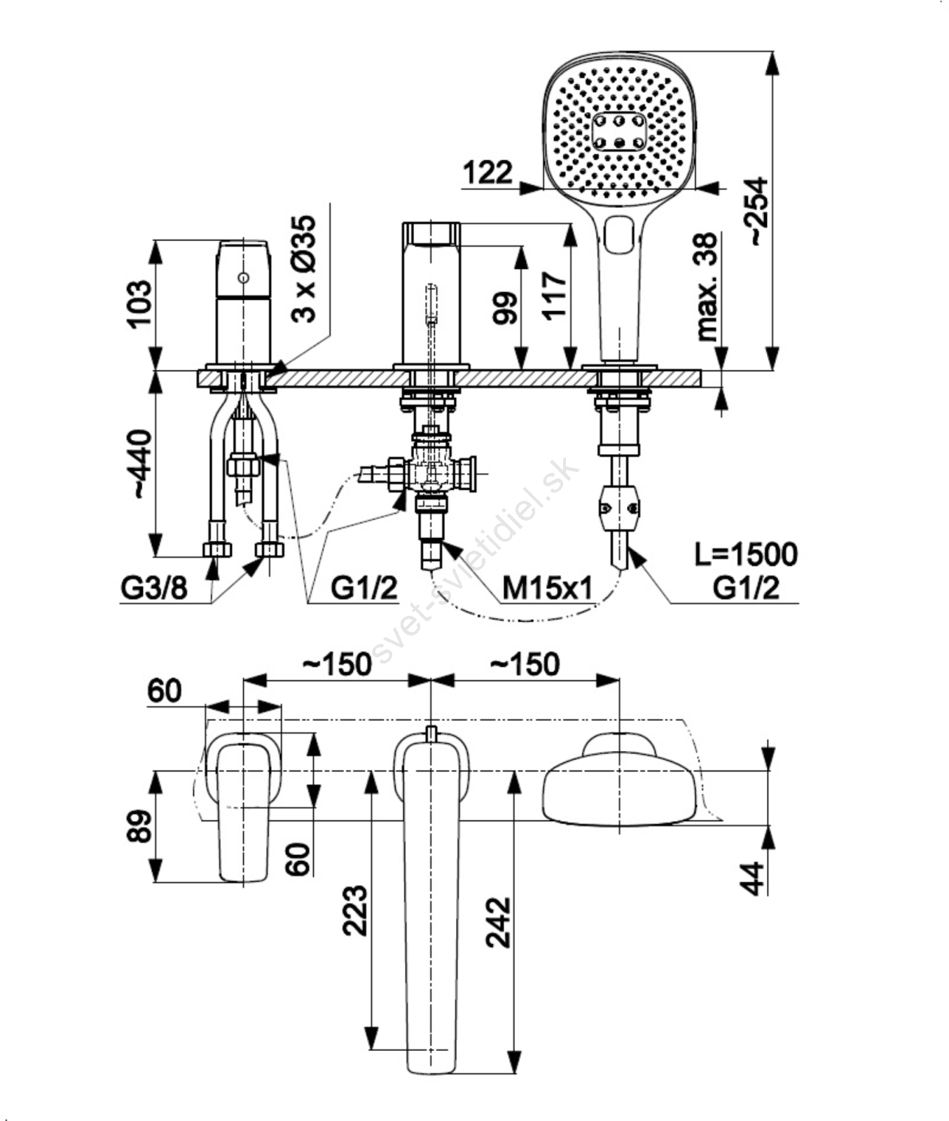 • Táto 3-otvorová vaňová batéria je elegantným doplnkom každej kúpeľne.