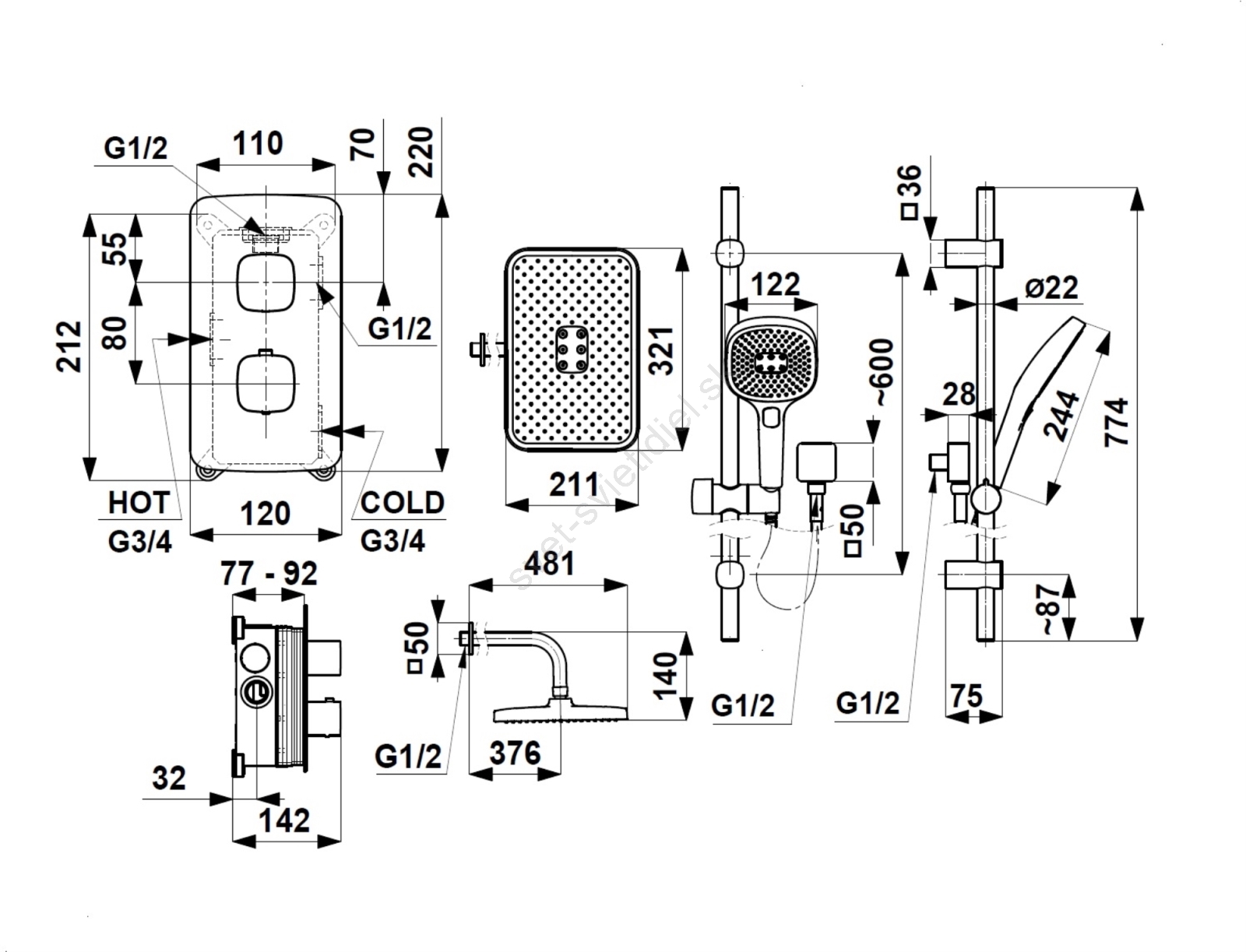 • Balenie obsahuje: podomietková krabica, kompletná batéria, rameno, sprchová hlavica s hadicou, skrytá posuvná sprcha.