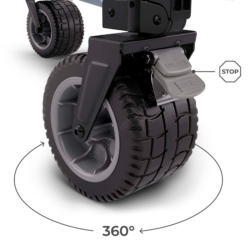 • Veľké terénne kolesá z PVC so šírkou 10 cm si ľahko poradia s pieskom, trávou aj štrkom, takže vozík zostáva stabilný aj na nerovnom povrchu.
