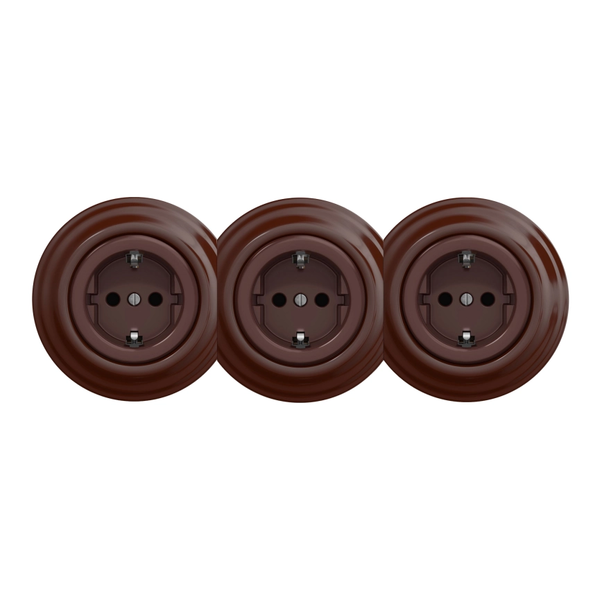 Kliklap - Trojitá retro zásuvka do domácnosti s rámikom SCHUKO 230V hnedá