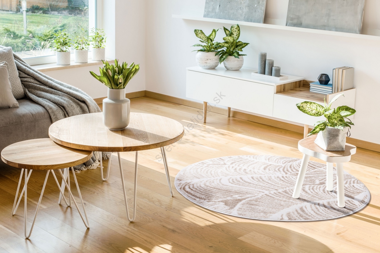 • Jemný béžový koberec s decentným listovým vzorom dodá každému priestoru nádych ľahkosti a útulnosti.