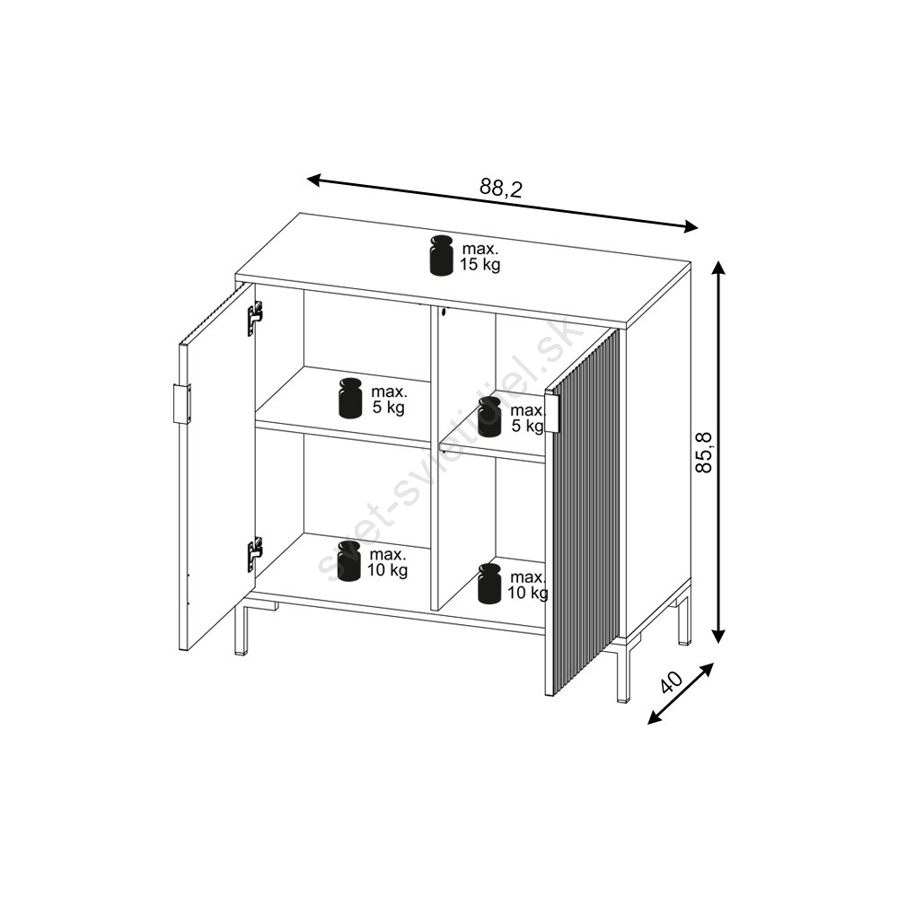 • Má štyri police a dve dvierka s vertikálnym rebrovaním.