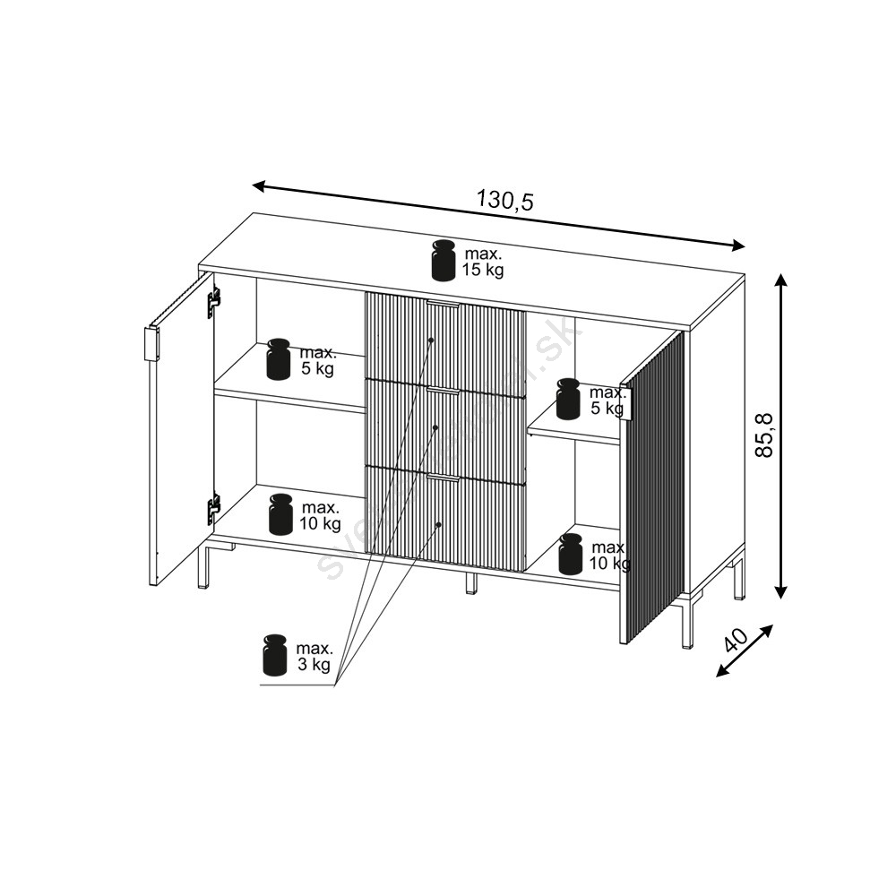 • Má štyri poličky, dve dvierka a tri zásuvky s vertikálnym žebrovaním.