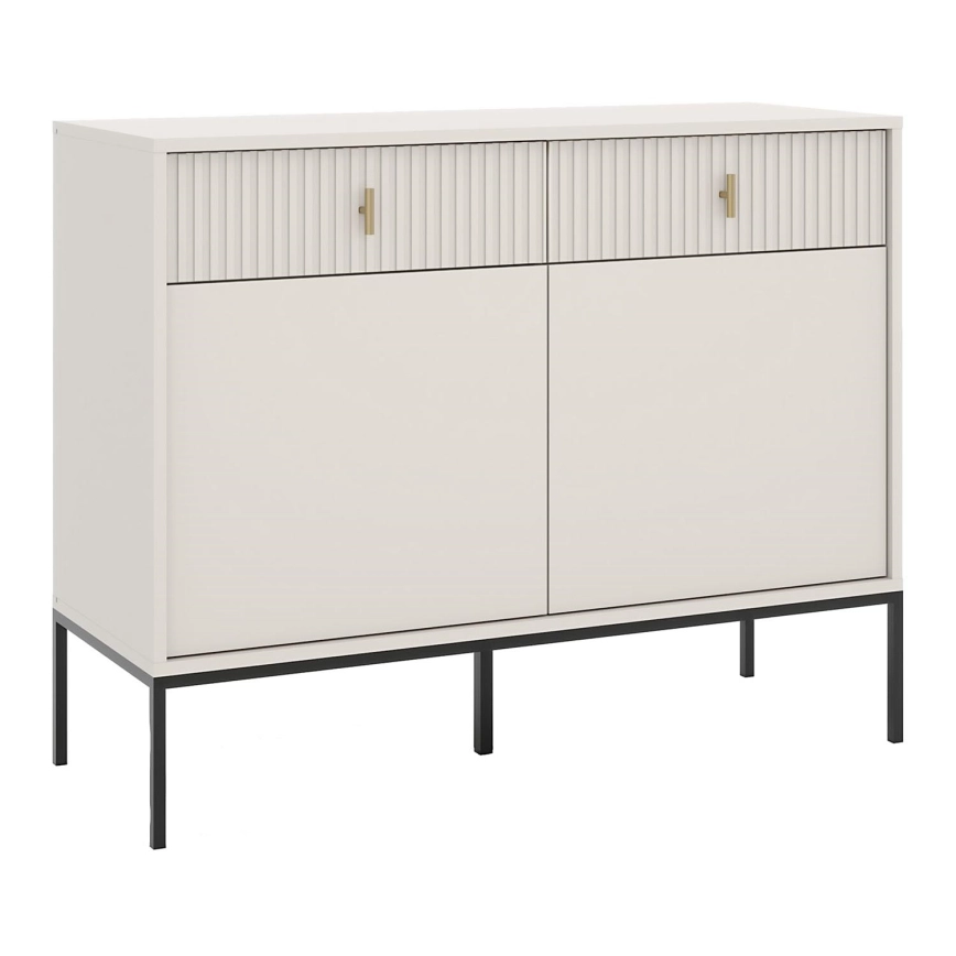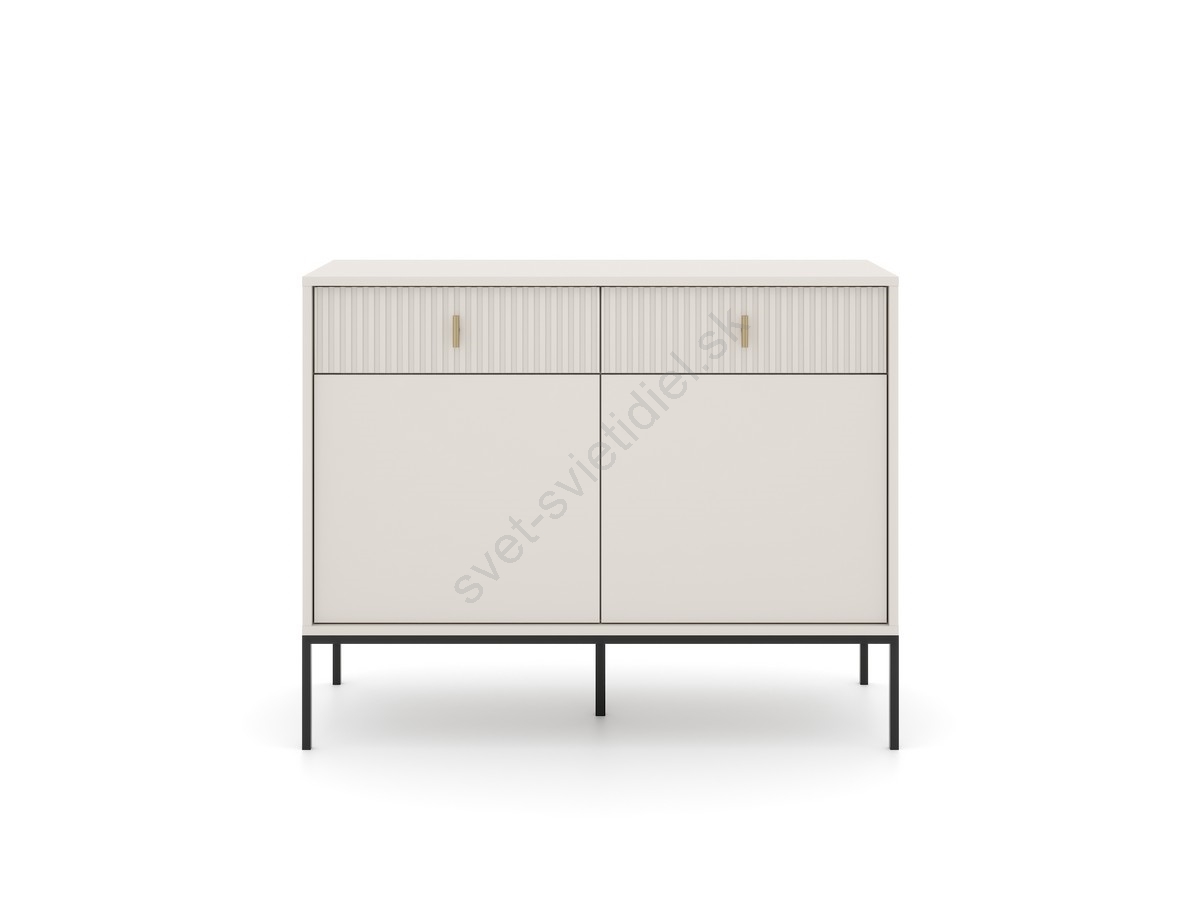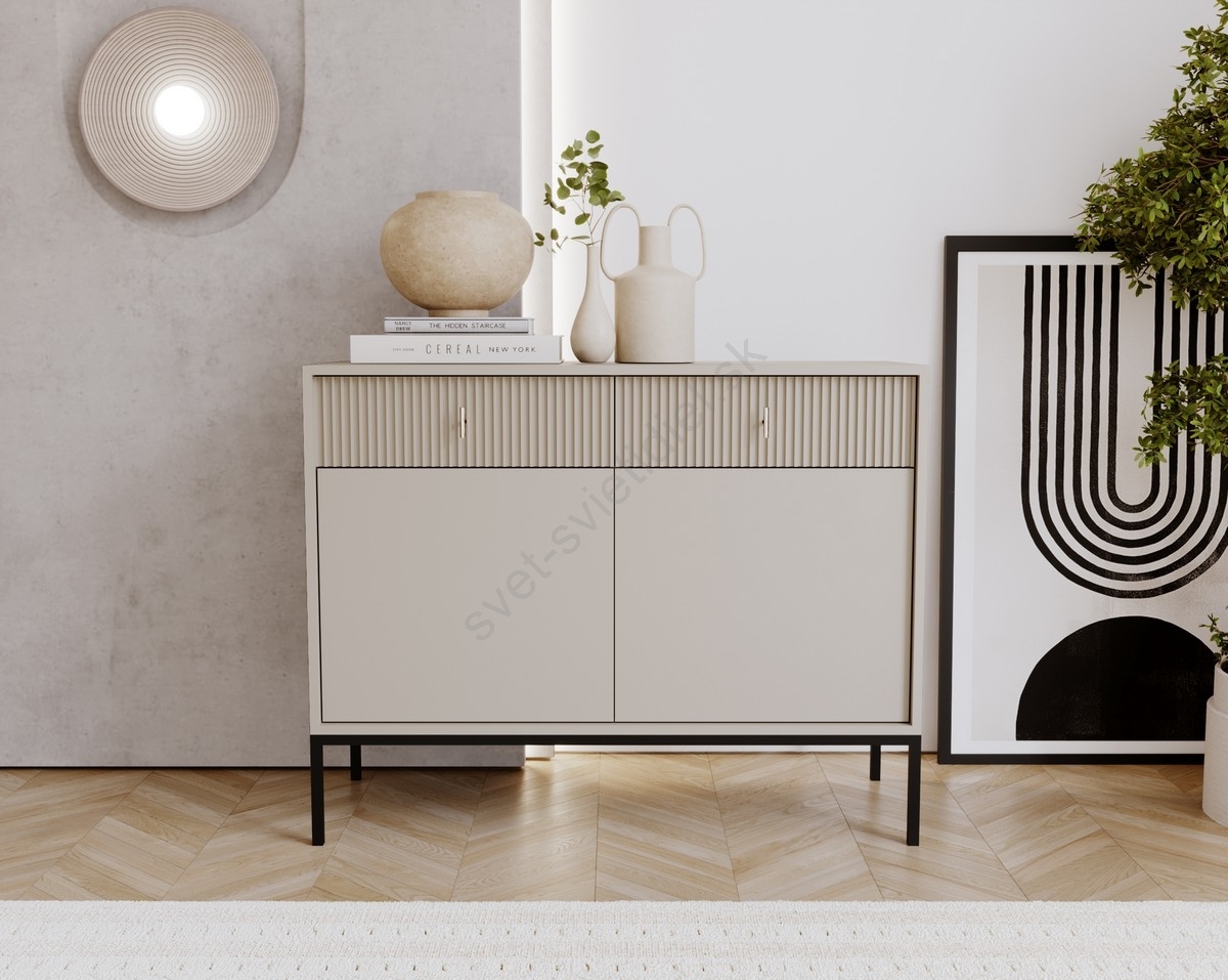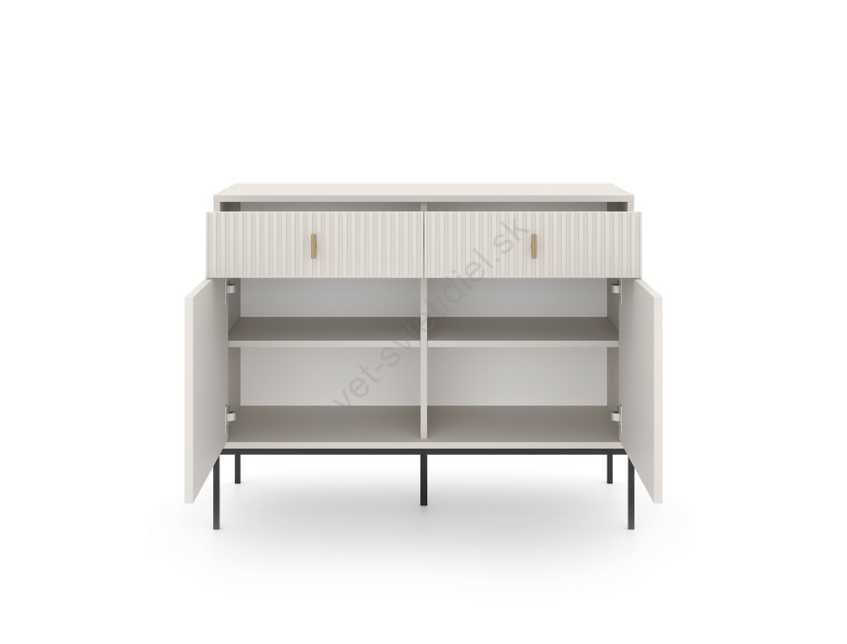 • Má dve spodné dvierka s veľkým úložným priestorom a dve zásuvky s úchytmi a vertikálnym rebrovaním.
