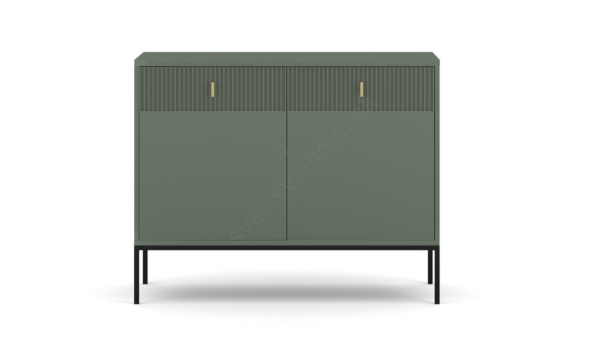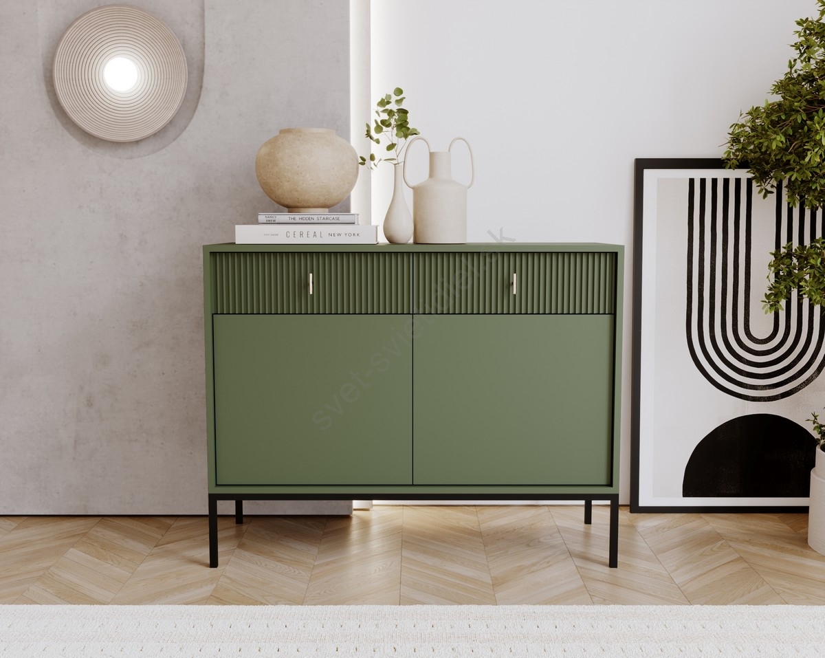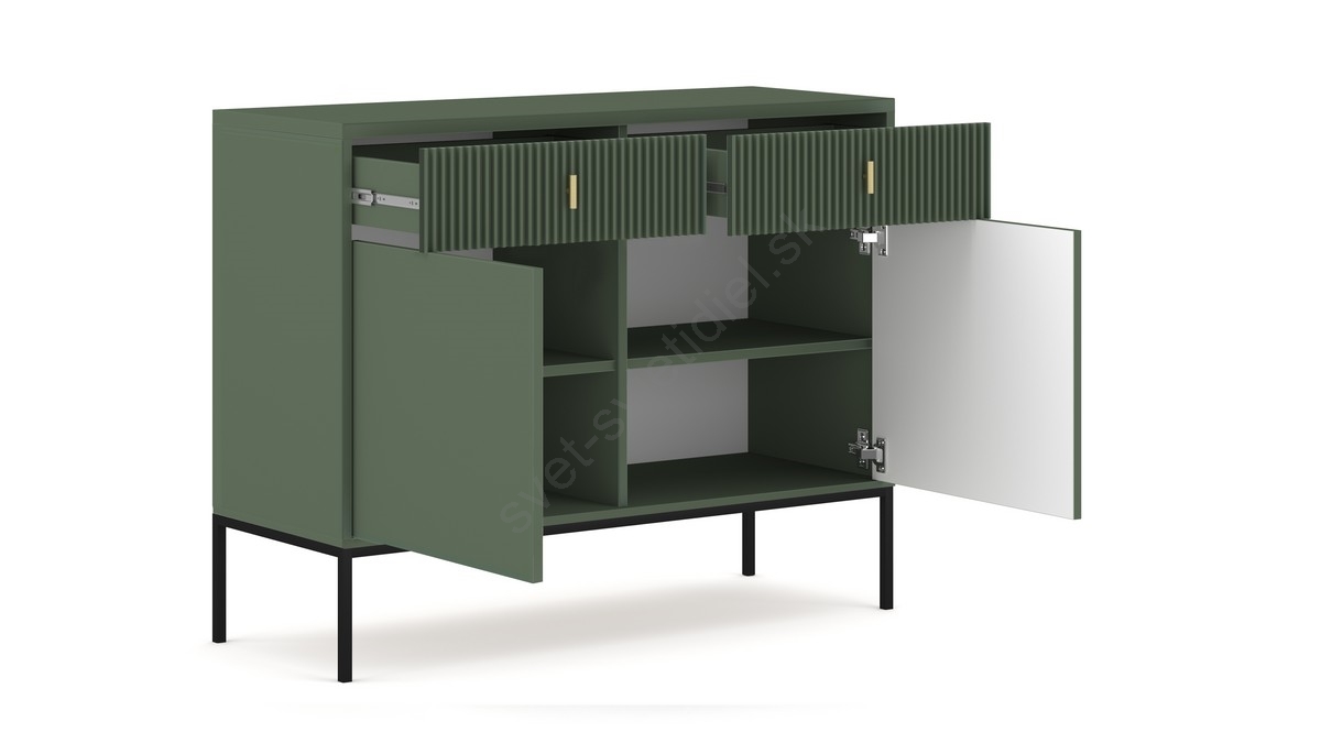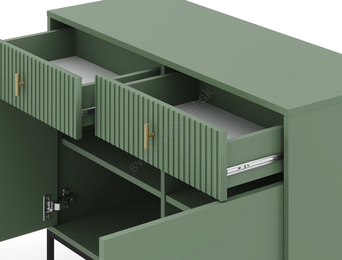 • Ponúka dve spodné dvierka s veľkým úložným priestorom a dve zásuvky s úchytmi a vertikálnym rebrovaním.