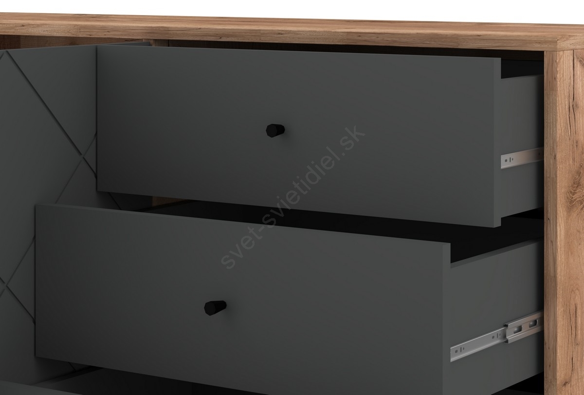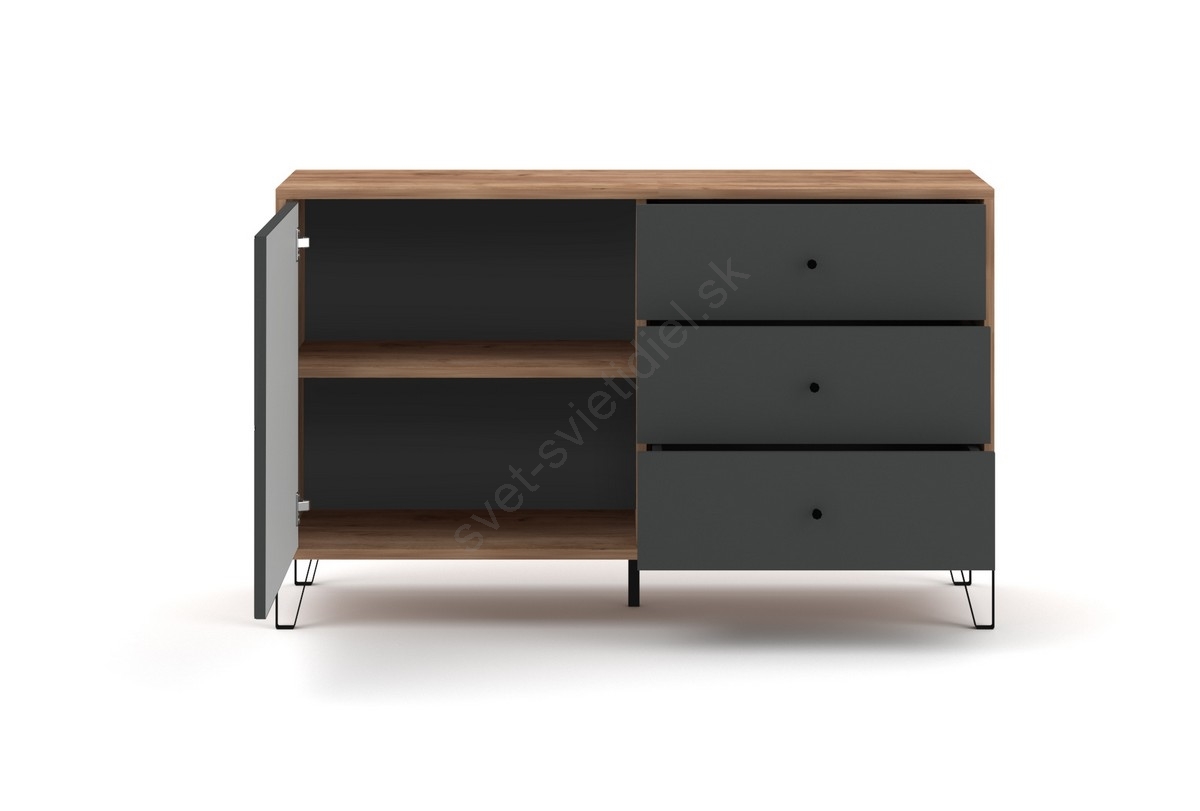• Má jedny dvierka na ľavej strane a tri zásuvky na pravej strane, ktoré umožňujú prehľadné uloženie vecí.