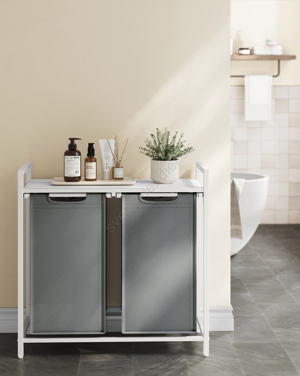 • 2 vrecká, 1 polica – Roztriedte si bielizeň do dvoch látkových vreciek (46 l na vrecko) a uložte pracie prostriedky, aviváž a ďalšie veci na policu.