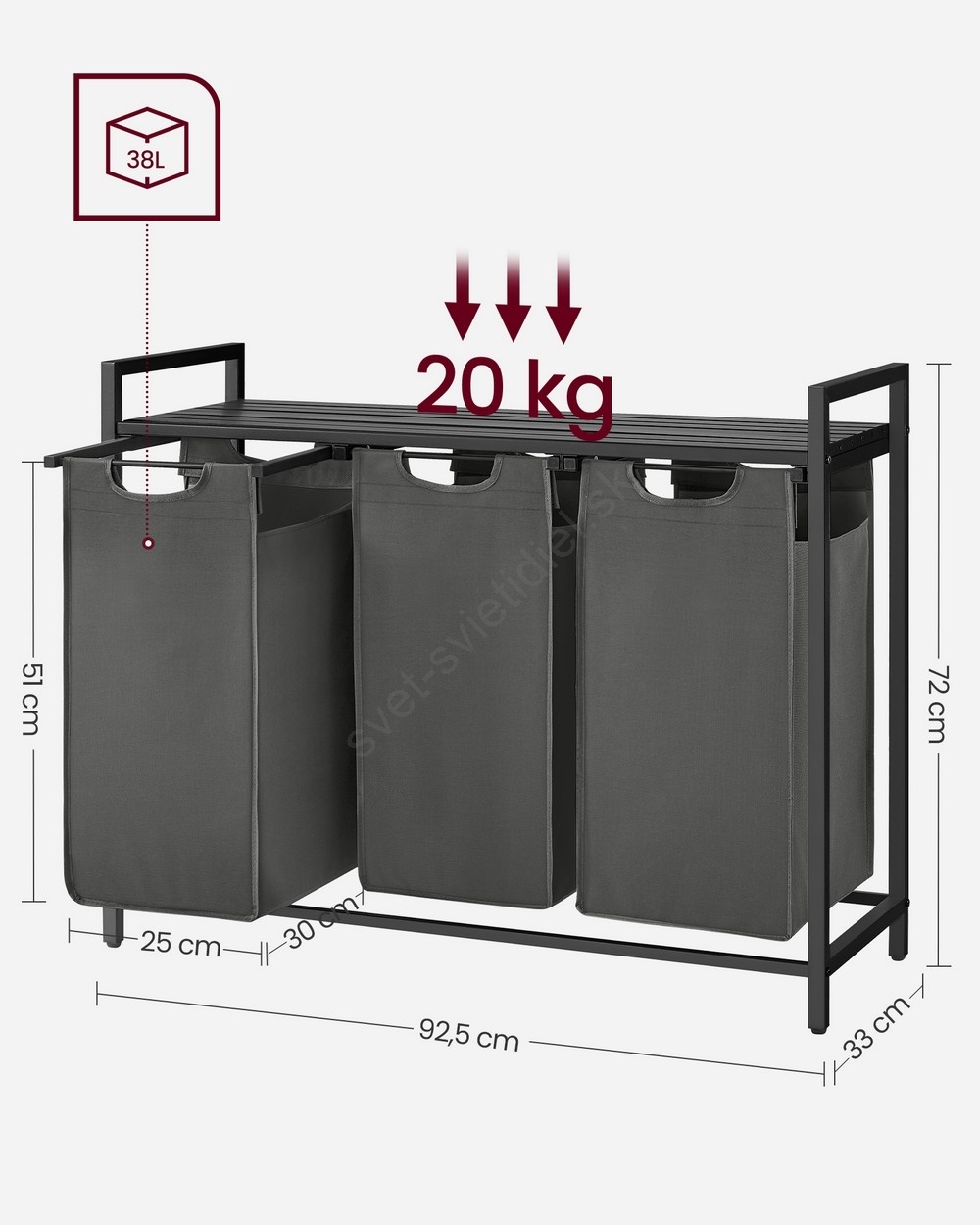 • 3 vrecká, 1 polica – Roztriedte si bielizeň do troch textilných vreciek (38 l na vrecko) a uložte pracie prostriedky, aviváž a ďalšie veci na poličku.