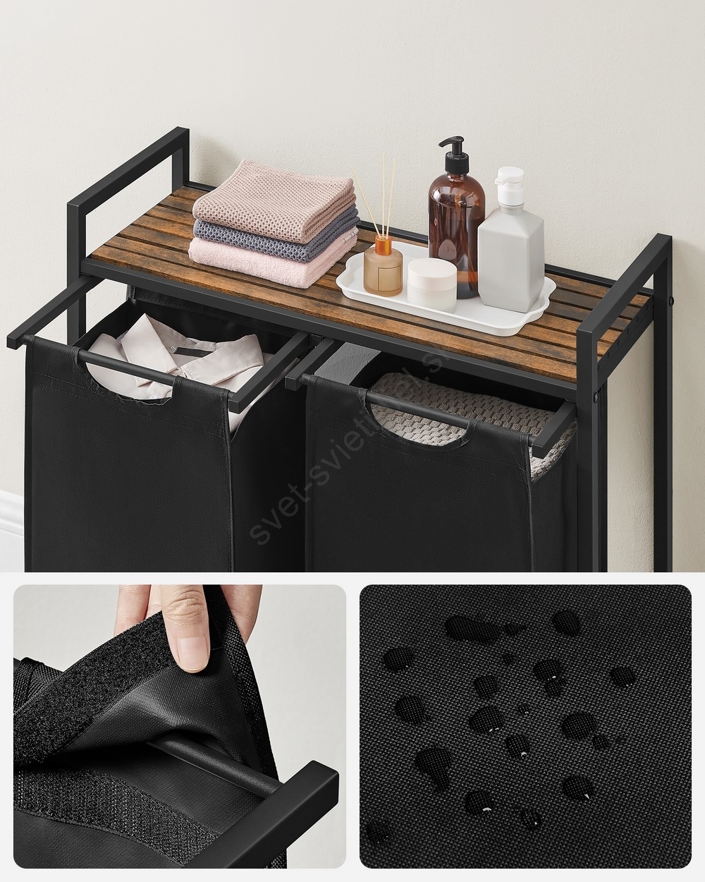 • 2 vrecia, 1 polica – Roztriedte bielizeň do dvoch textilných vriec (46 l na vrece) a umiestnite pracie prostriedky, aviváž a ďalšie veci na policu.