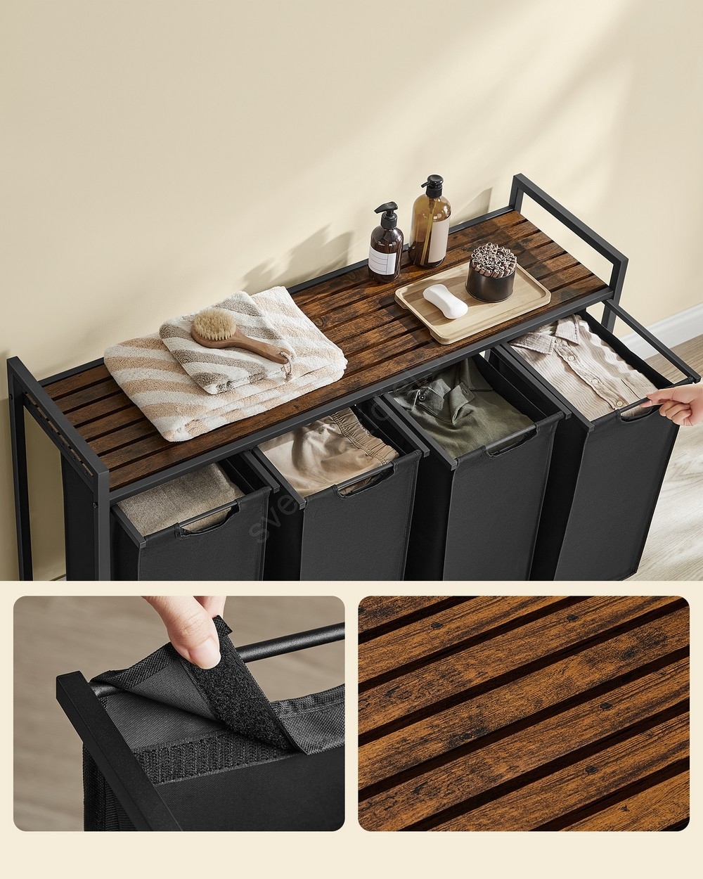 • 4 vrecká, 1 polica – Roztriedte si bielizeň do štyroch textilných vreciek (40 l na vrecko) a uložte pracie prostriedky, aviváž a ďalšie veci na policu.