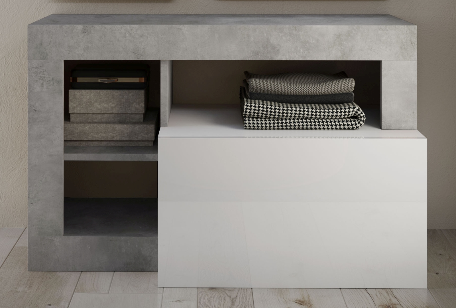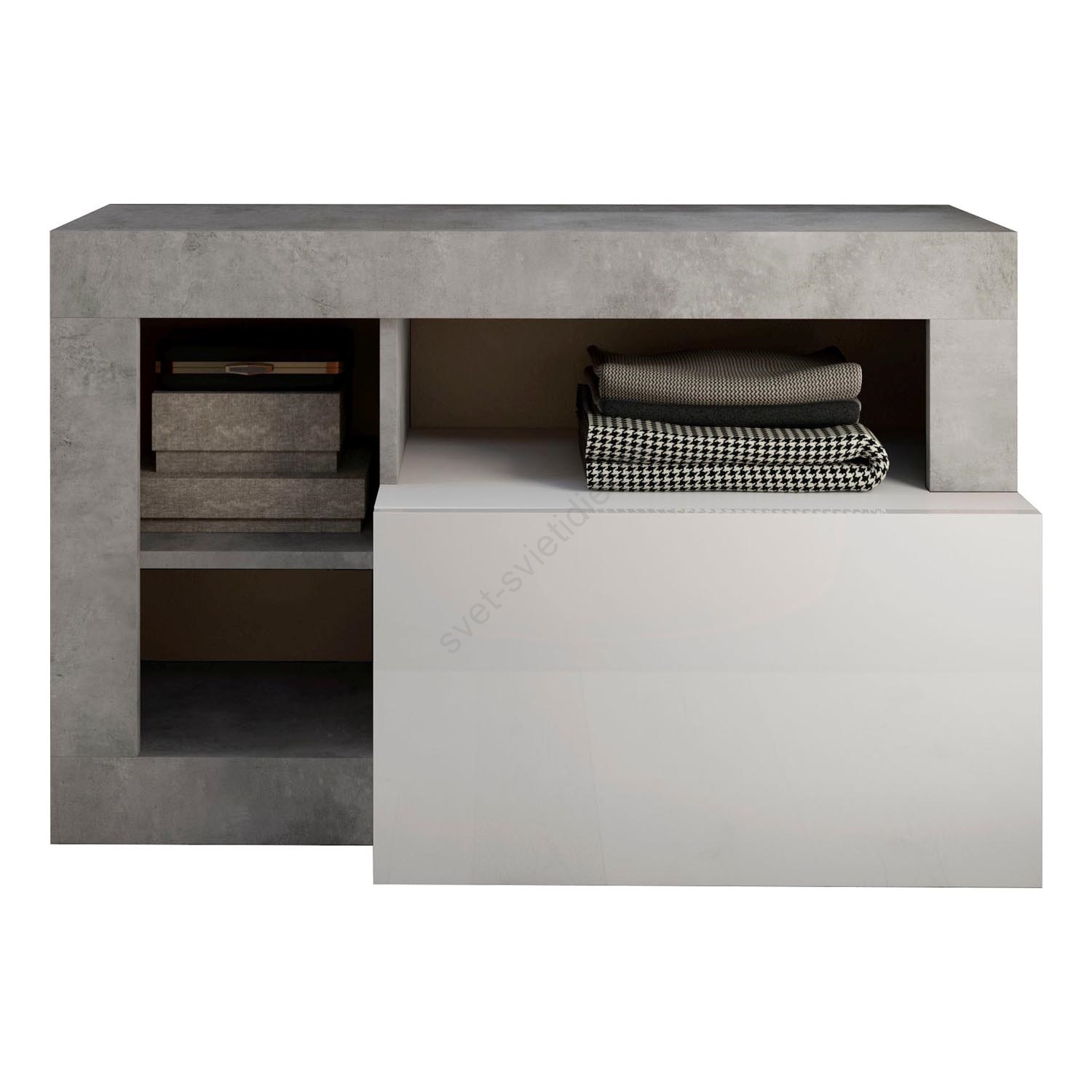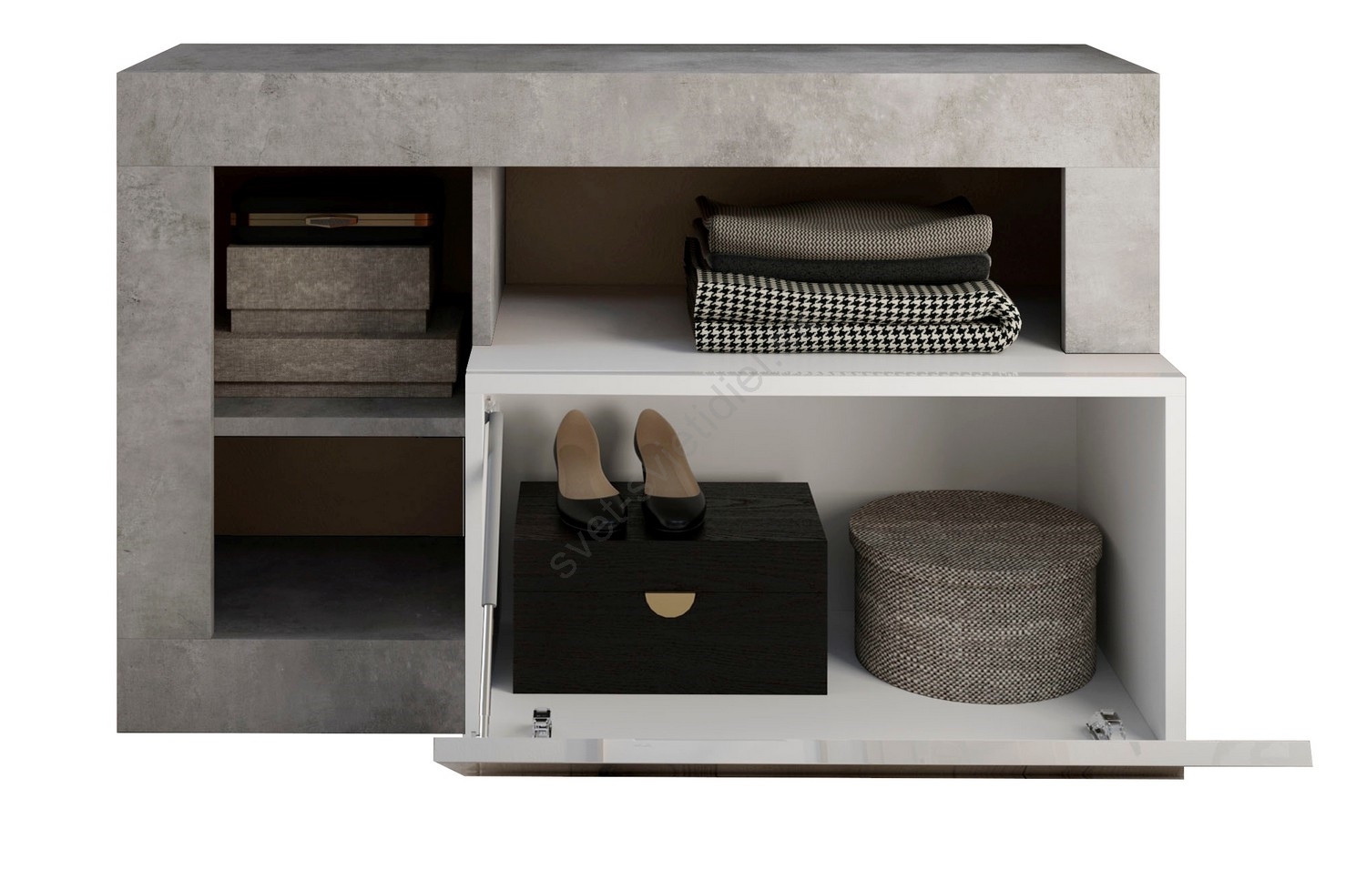 • Disponuje 3 otvorenými policami a vnútornou policou s výklopným otváraním na uloženie tašiek, topánok a sezónnych vecí.