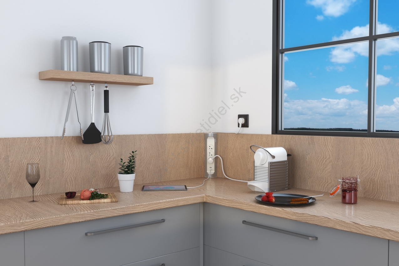 • Rohový predlžovací prívod so tromi zásuvkami a dvoma USB konektormi.