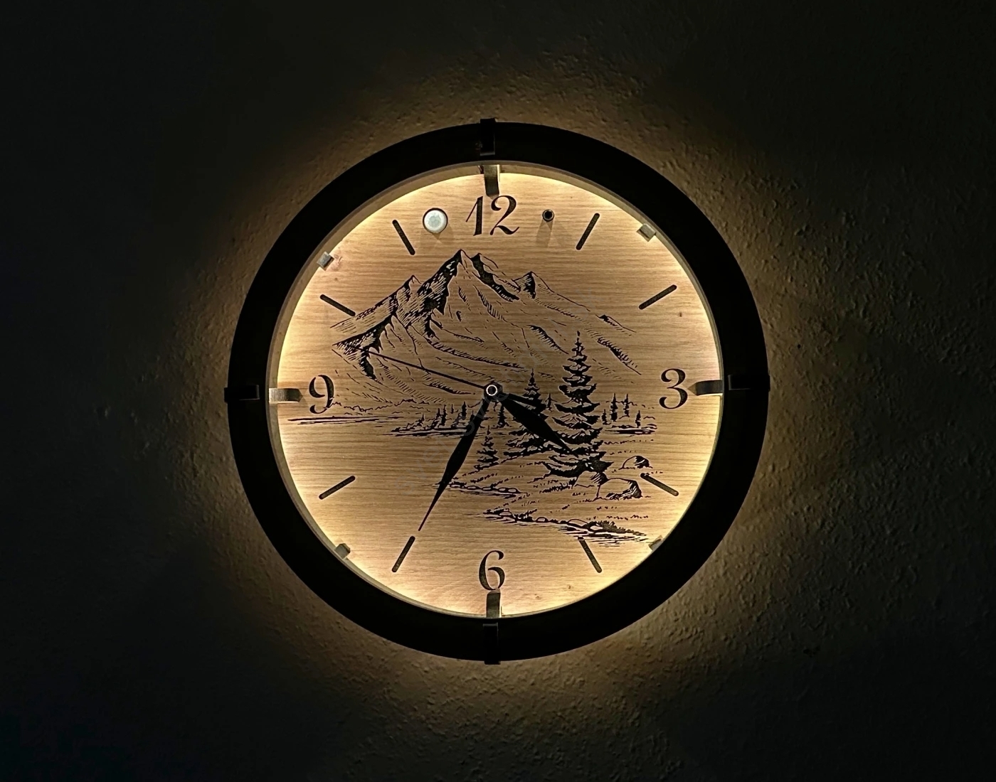 • Li-Go 23697/DUB/BAT2 - stmievateľné LED hodiny s pohybovým senzorom LED/10W/5V 20000 mAh + 1xAA pr. 32 cm dub/Hory