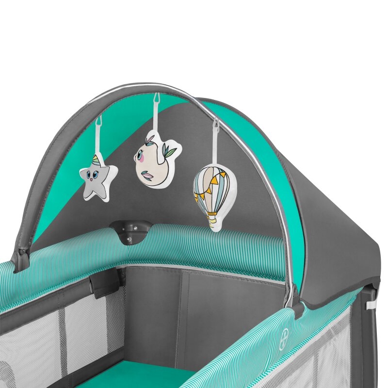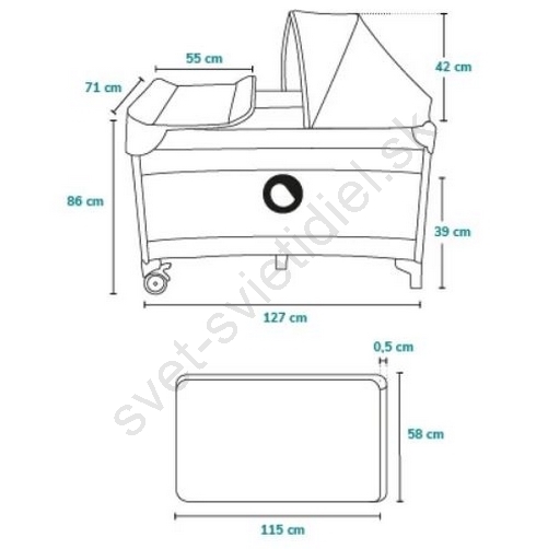 • Súčasťou balenia: prebaľovací pult s bočnými vreckami (na plienky, púder a pod.), košík na príslušenstvo s dvoma priehradkami, veľká moskytiéra, strieška a hrazdička s plyšovými hračkami.