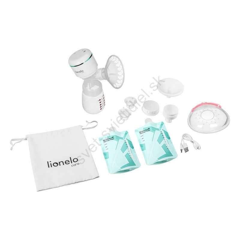 • Balenie obsahuje navyše viečko, USB kábel, nádobu na odsaté mlieko (180 ml), uzáver fľaše, dva vrecká na uskladnenie materského mlieka a bavlnené puzdro pre jednoduché prenášanie odsávačky.