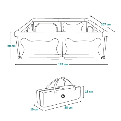 • Veľkosť ohrádky umožňuje voľný pohyb, prevaľovanie sa, plazenie sa a prvé krôčky bez rizika opustenia priestoru.