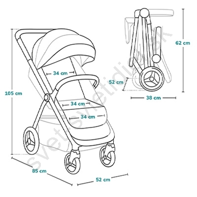 • Je vybavený systémom automatického skladania, čo znamená, že po stlačení tlačidla a uvoľnení poistky sa kočík automaticky zloží do kompaktných rozmerov.