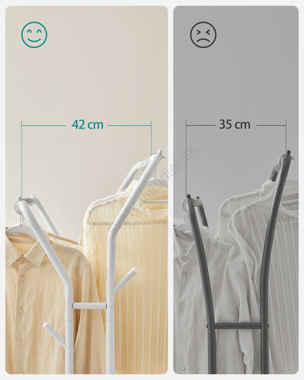 • Rozostup 42 cm medzi tyčami na zavesenie oblečenia umožňuje ľahké prúdenie vzduchu a podporuje rýchle schnutie.