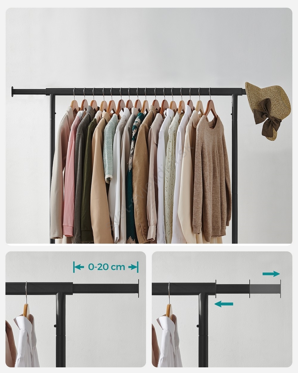 • Horná tyč unesie až 130 kg (pri rovnomernom zaťažení) bez kývania alebo prevrátenia, vysúvacia tyč poskytuje ďalší priestor navyše pre vaše oblečenie, klobúky, tašky a pod.