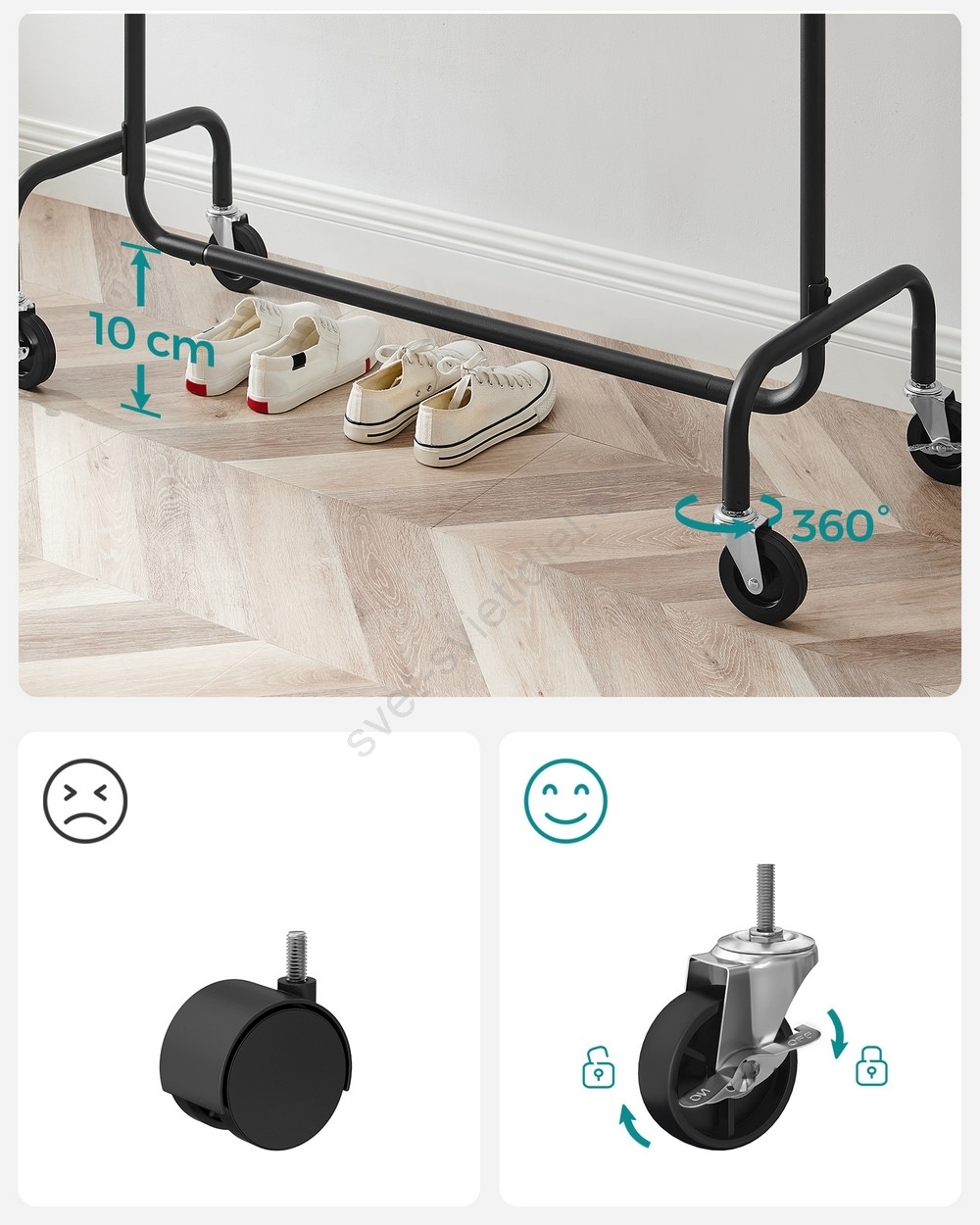 • 4 odolné a 360° otáčavé PP kolieska (2 brzdy) uľahčujú presúvanie alebo ponechanie stojana na mieste.