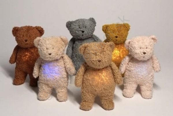 • Bruško medvedíka svieti a slúži ako nočné svetlo s výberom siedmich farieb svietenia.