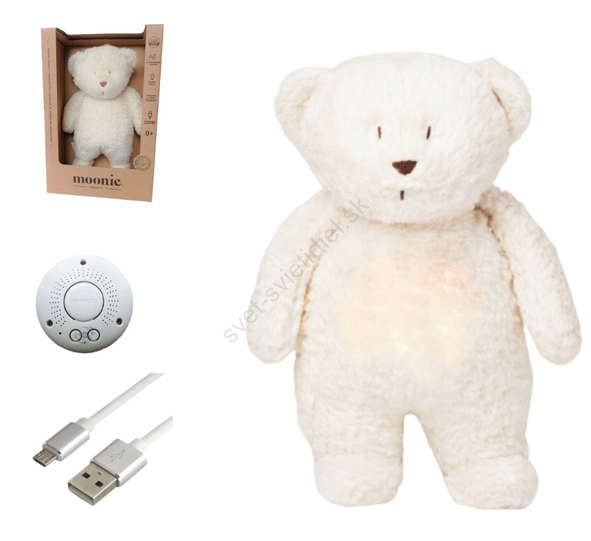 • Moonie uspávačik v podobe roztomilého medvedíka s nočným svetlom a relaxačnými zvukmi pomáha bábätku upokojiť sa a ľahšie zaspať.